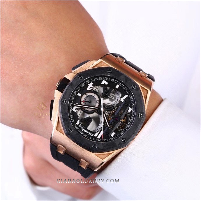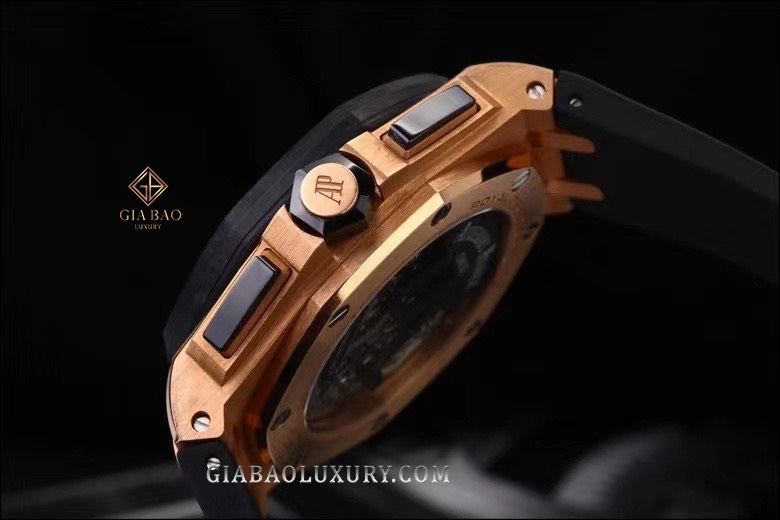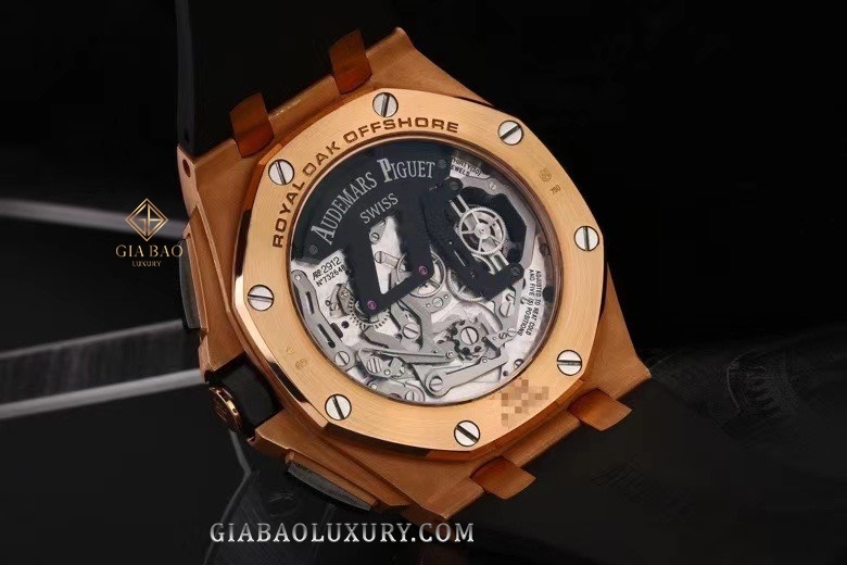 Hai bộ phận có tông màu tối tạo nên sự tương phản mạnh mẽ với vỏ đồng hồ được làm từ vàng hồng 18K. Như đã nói ở trên, bộ vỏ của Royal Oak Offshore to lớn hơn so với Royal Oak, có đường kính lên tới 44mm. Không chỉ to hơn về đường kính, độ dày của chiếc Audemars Piguet Royal Oak Offshore 26288OF.OO.D002CR.01 cũng khá ấn tượng, vào khoảng 16.6mm.