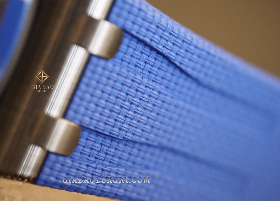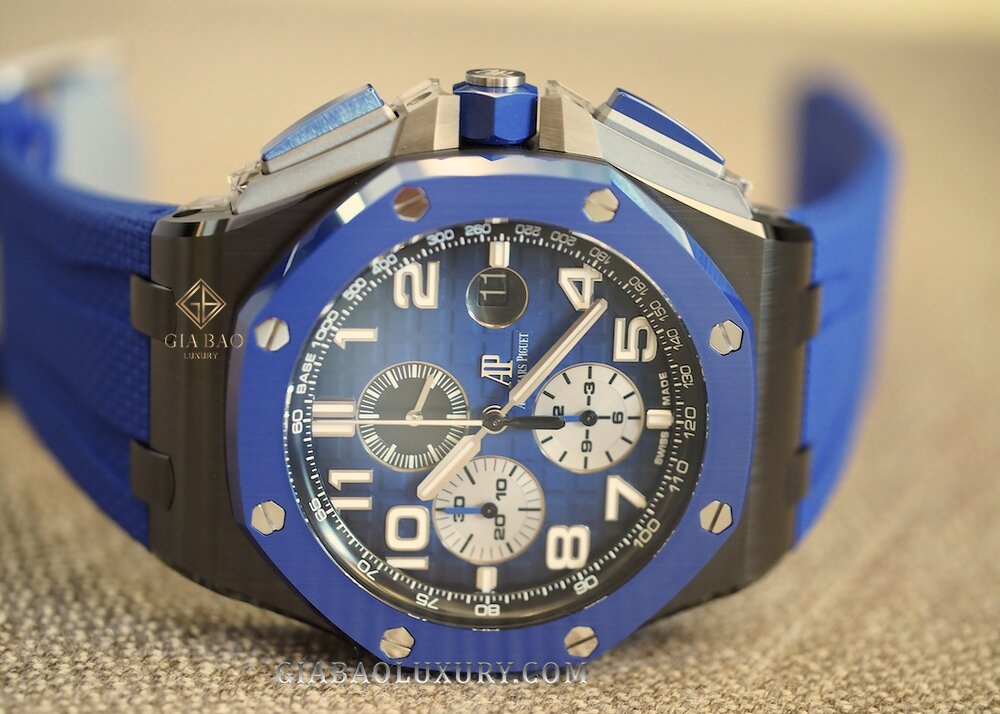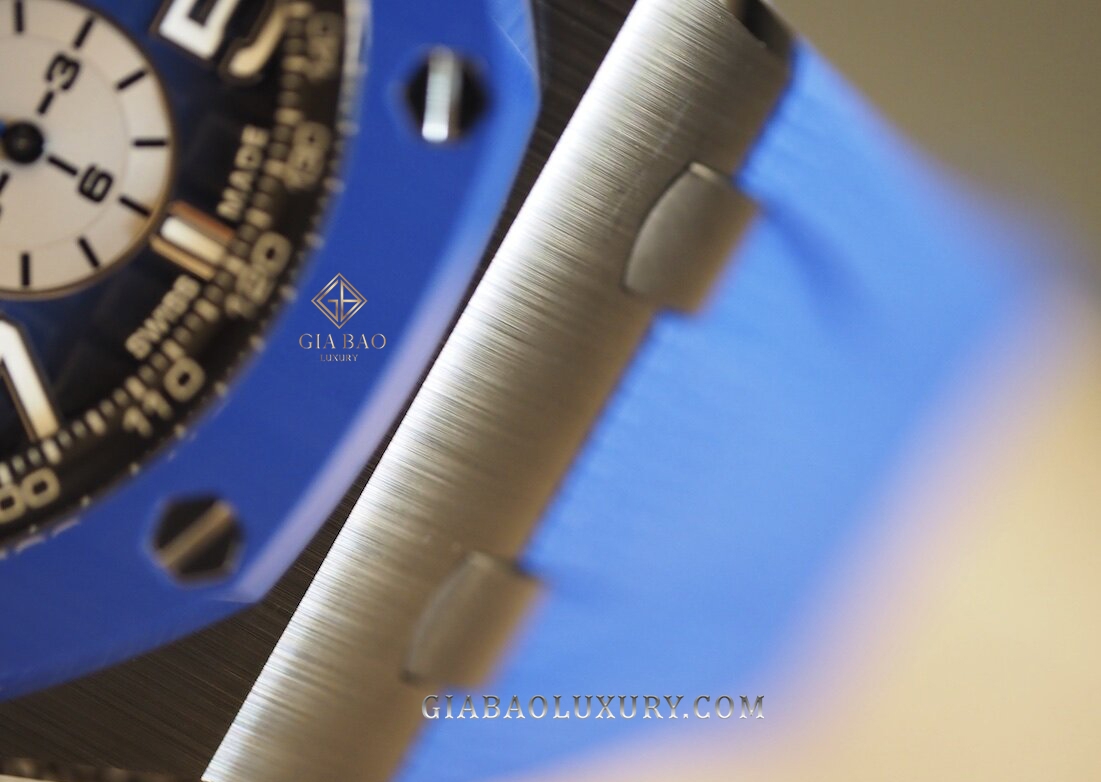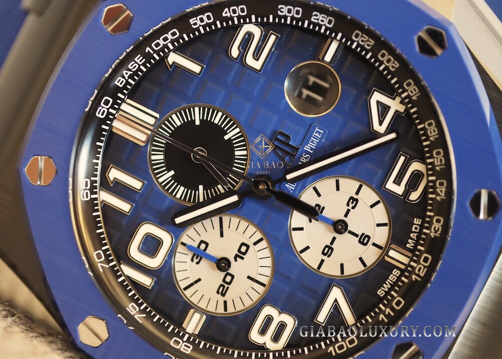 Vành bezel được cắt gọt sắc nét với quen thuộc ở những chiếc đồng hồ Royal Oak Offshore. Vành bezel làm bằng ceramic chải xước được cố định bởi 8 chiếc vít màu bạc. Dây đeo thời trang bằng cao su dạng khóa cài tiện dụng. Các cửa sổ phụ được đặt ở các vị trí 3h, 6h, 9h và 12h rất cân đối tạo thành một tổng thể hài hòa.