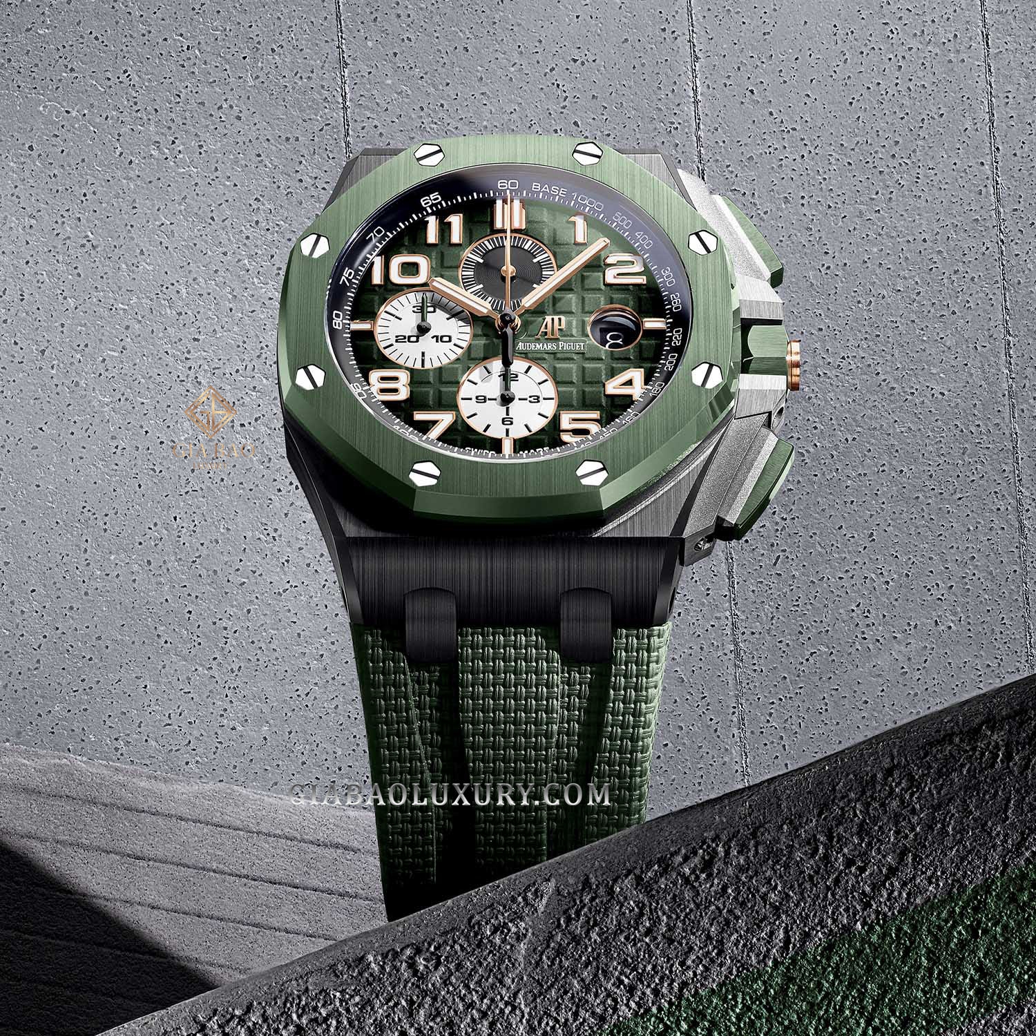 Đồng Hồ Audemars Piguet Royal Oak Offshore 26405CE.OO.A056CA.01 gây ấn tượng với giới mộ điệu ngay từ cái nhìn đầu tiên bởi màu sắc xanh lá trẻ trung và nổi bật. Nếu bạn muốn mọi con mắt đổ dồn sự chú ý về mình thì dây chính là một sự lựa chọn phù hợp.