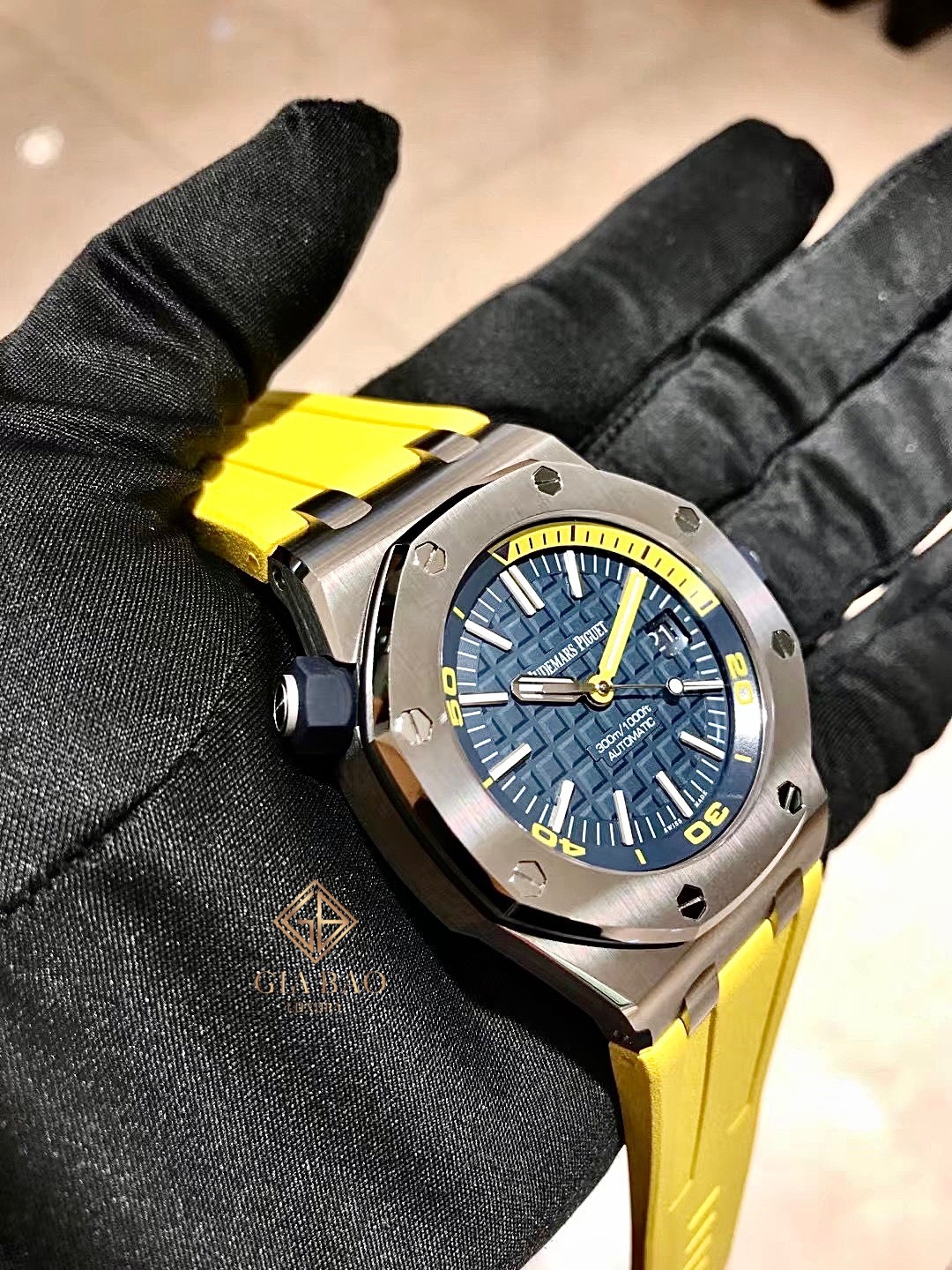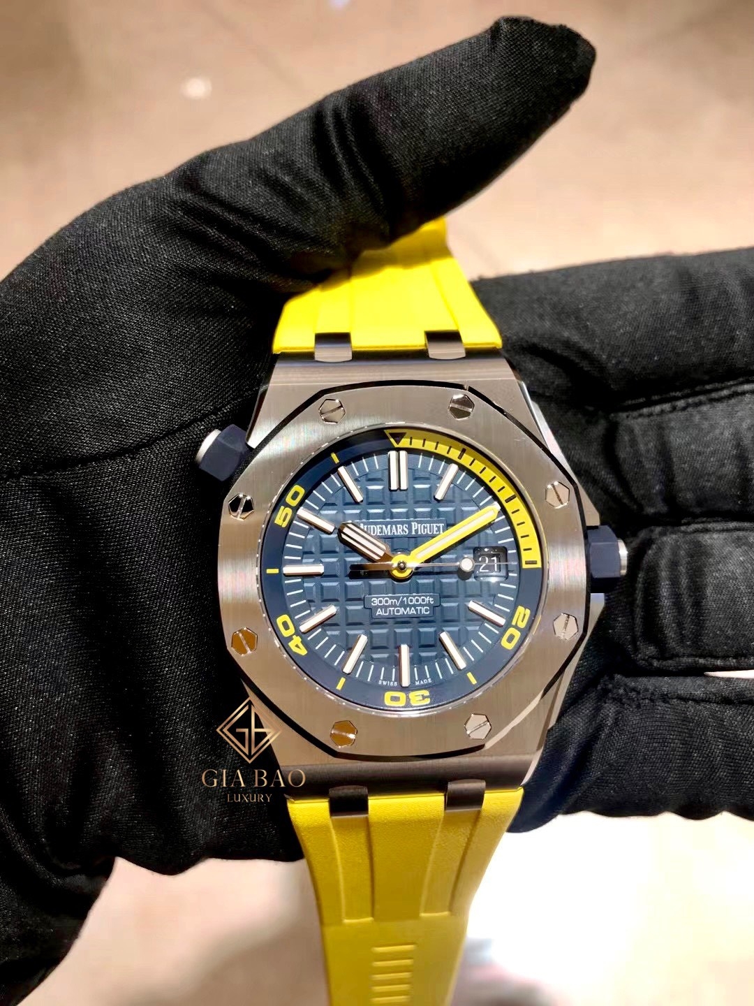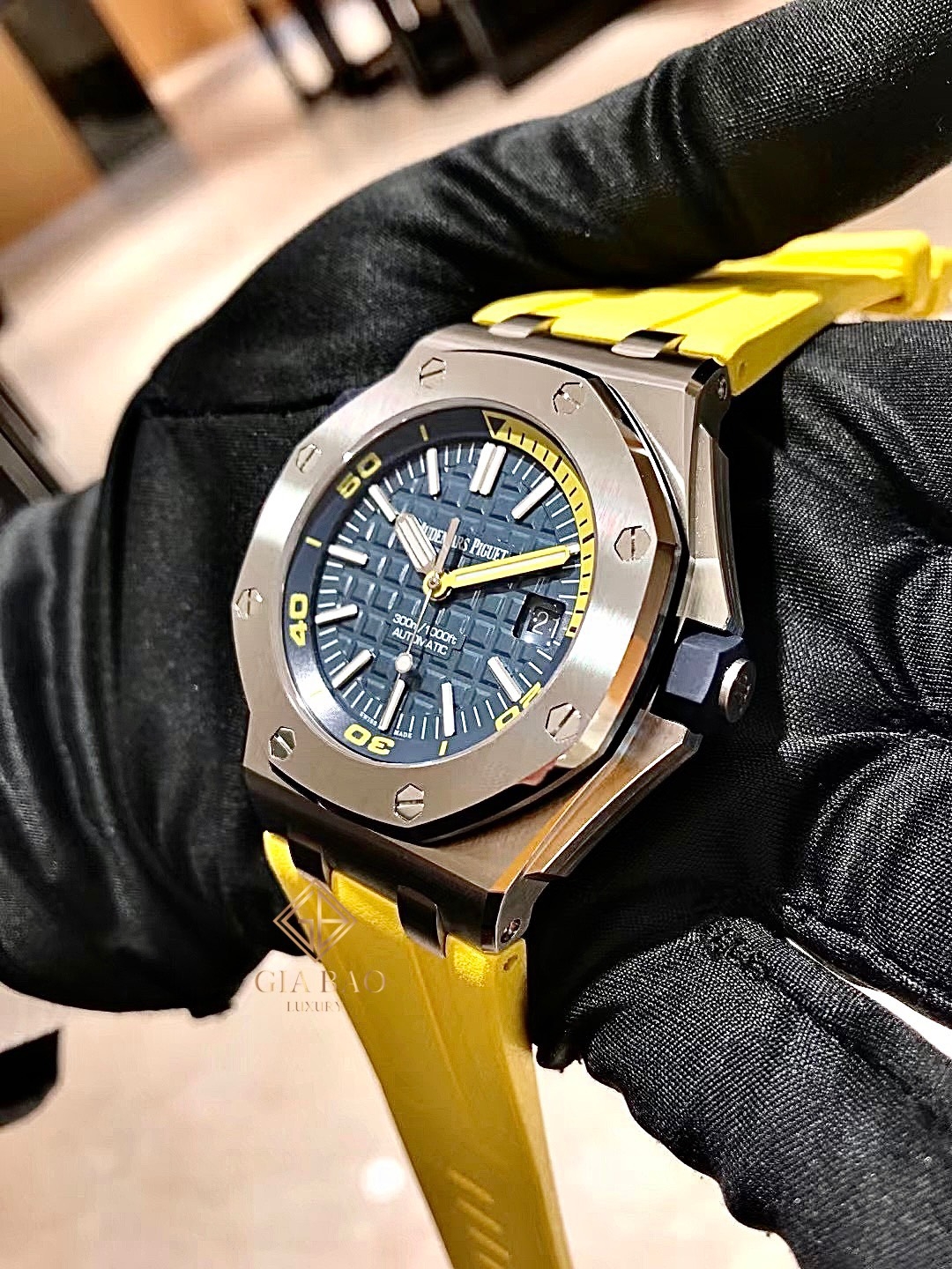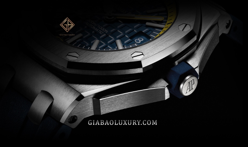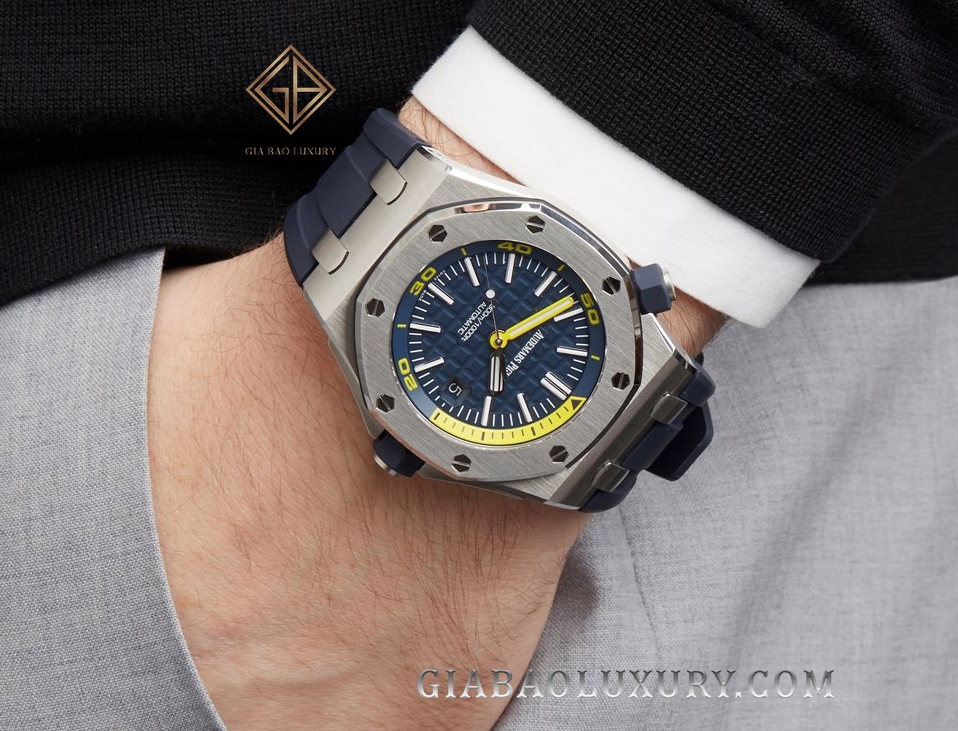 Nếu như quý vị đang tìm kiếm một chiếc đồng hồ lặn màu sắc sặc sỡ phù hợp với những khách hàng trẻ tuổi, Gia Bảo Luxury sẽ đề xuất model Royal Oak Offshore mang mã hiệu 15710ST.OO.A027CA.01 với lớp vỏ bằng thép cùng màu xanh Navy điểm sắc vàng chanh rực rỡ.