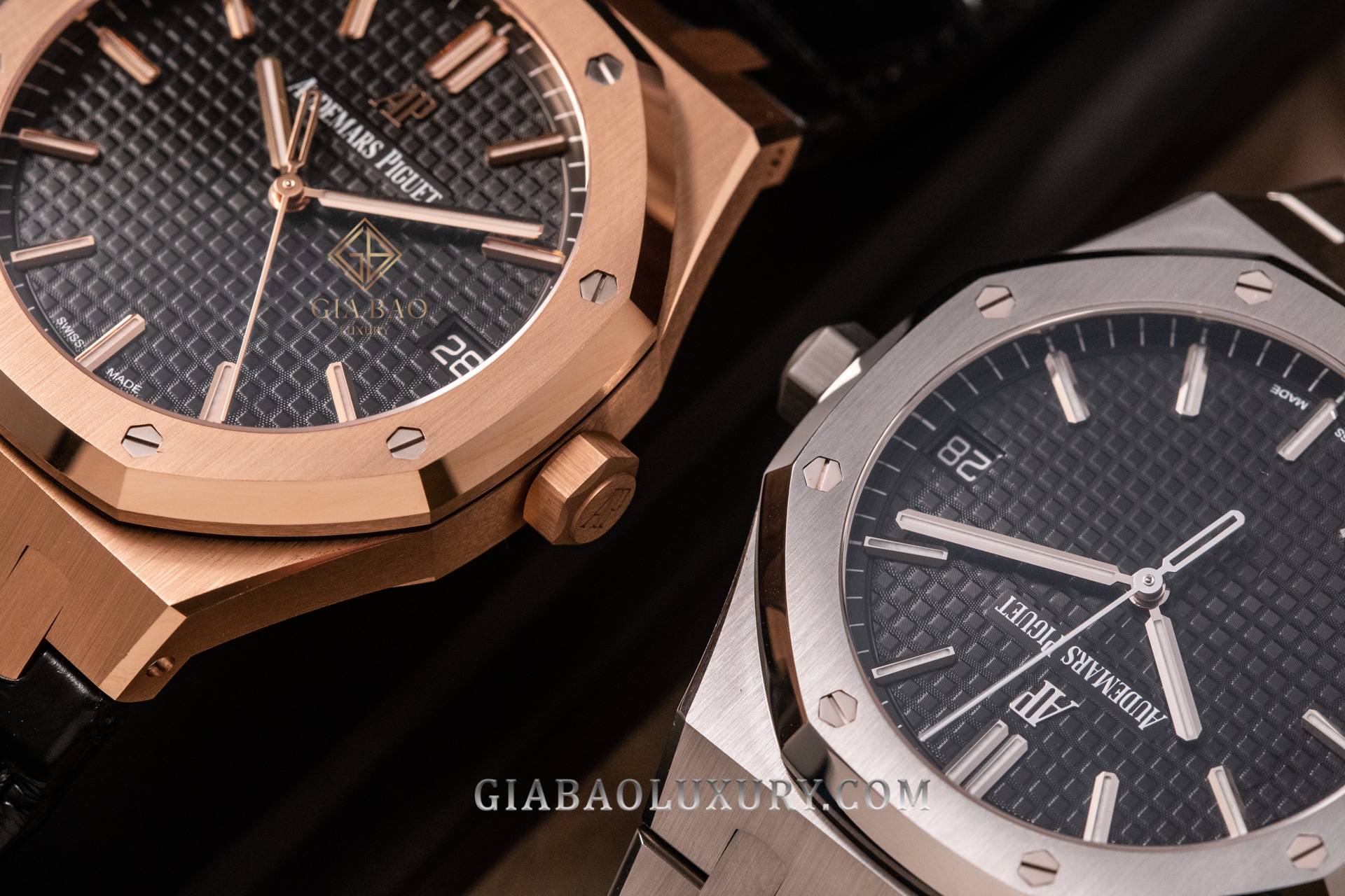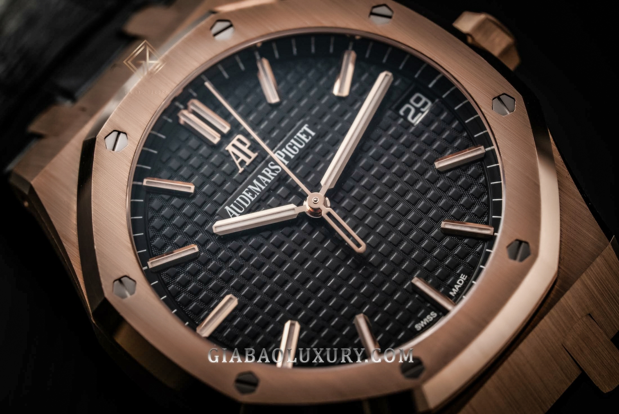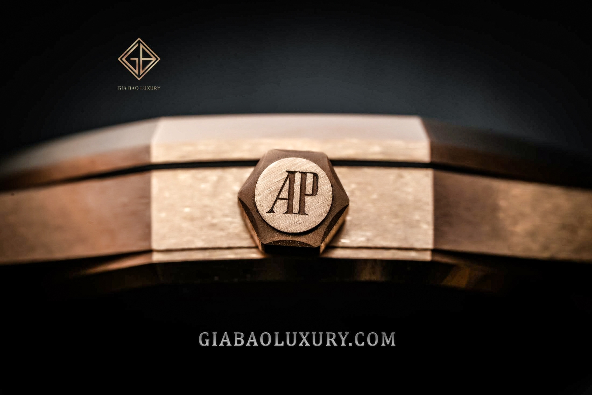 Dưới bàn tay tài hoa của các nghệ nhân chế tác đồng hồ bậc thầy, chiếc đồng hồ mang mã hiệu 15500OR.OO.D002CR.01 sở hữu lớp vỏ làm từ vàng hồng có đường kính 41mm đi kèm bộ dây làm từ da cá sấu. Vành bezel bát giác đặc trưng với những góc cạnh được cố định và bảo vệ bởi tám ốc vít hình lục giác. Nét đặc trưng truyền thống của bộ sưu tập huyền thoại vẫn được gìn giữ thể hiện qua những đường vân chải xước trên bộ vỏ cùng các cạnh đánh bóng đan xen lẫn nhau, tạo độ tương phản và điểm nhấn đẹp mắt.