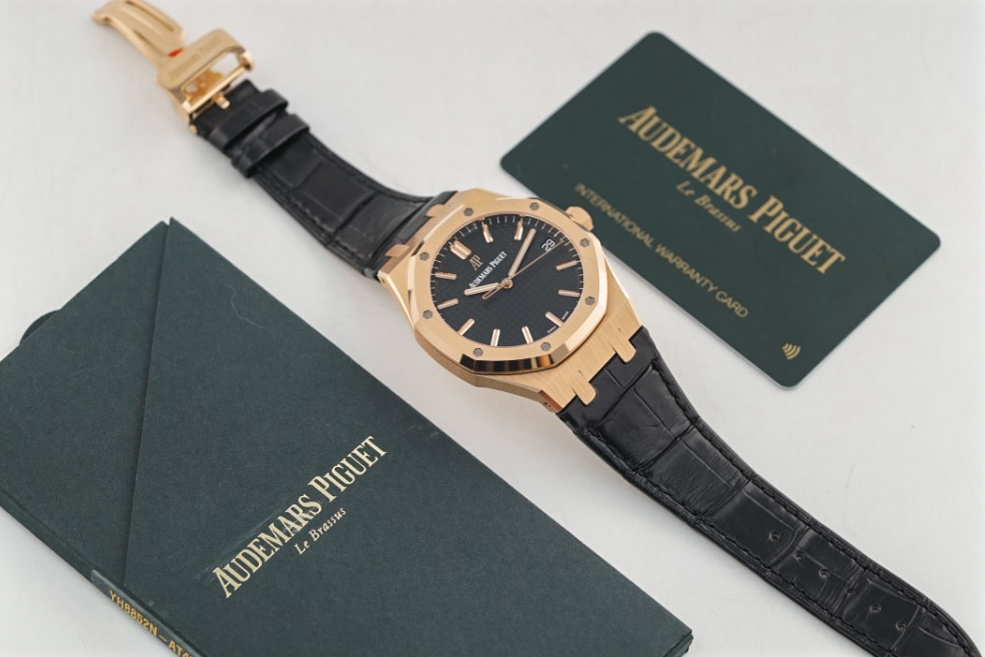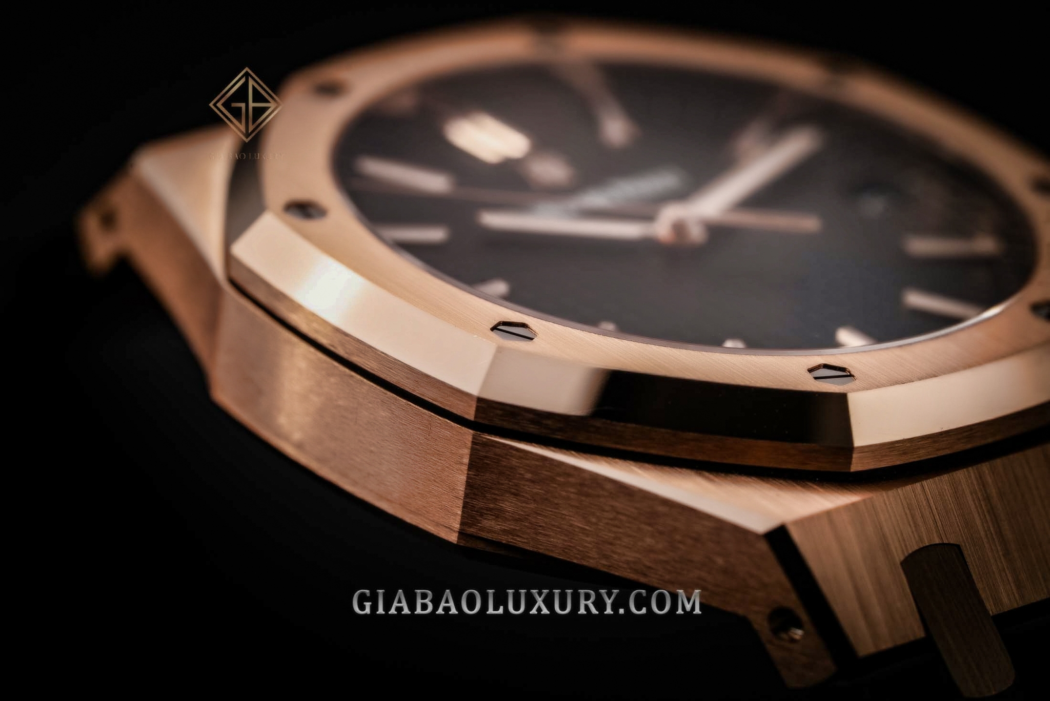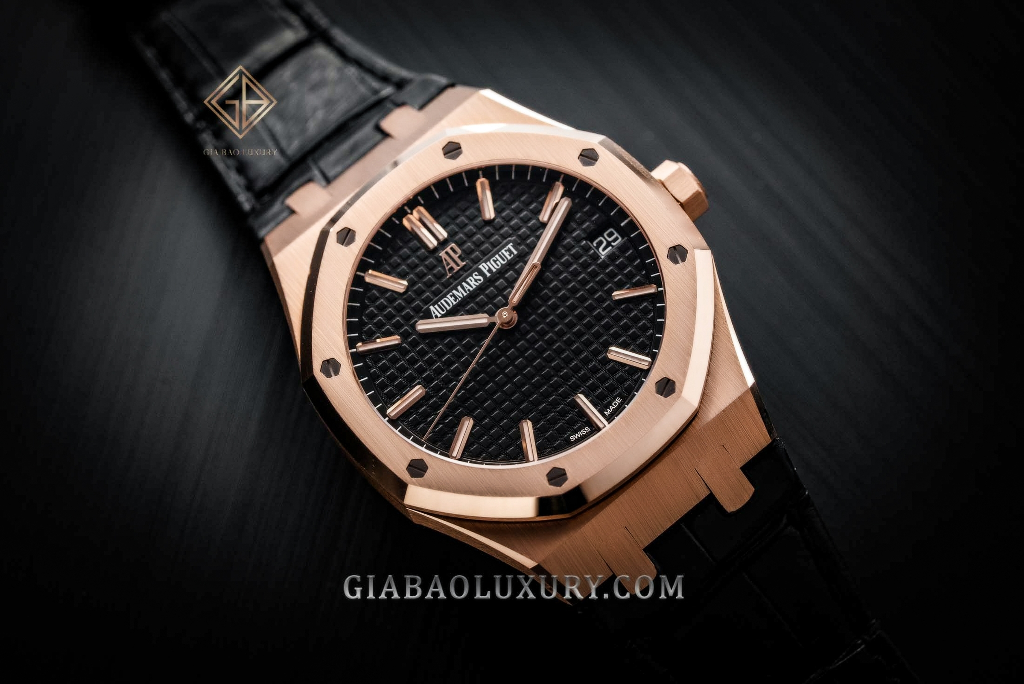 Dưới bàn tay tài hoa của các nghệ nhân chế tác đồng hồ bậc thầy, chiếc đồng hồ mang mã hiệu 15500OR.OO.D002CR.01 sở hữu lớp vỏ làm từ vàng hồng có đường kính 41mm đi kèm bộ dây làm từ da cá sấu. Vành bezel bát giác đặc trưng với những góc cạnh được cố định và bảo vệ bởi tám ốc vít hình lục giác. Nét đặc trưng truyền thống của bộ sưu tập huyền thoại vẫn được gìn giữ thể hiện qua những đường vân chải xước trên bộ vỏ cùng các cạnh đánh bóng đan xen lẫn nhau, tạo độ tương phản và điểm nhấn đẹp mắt.