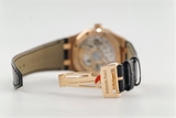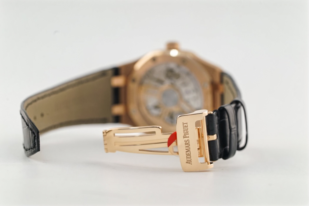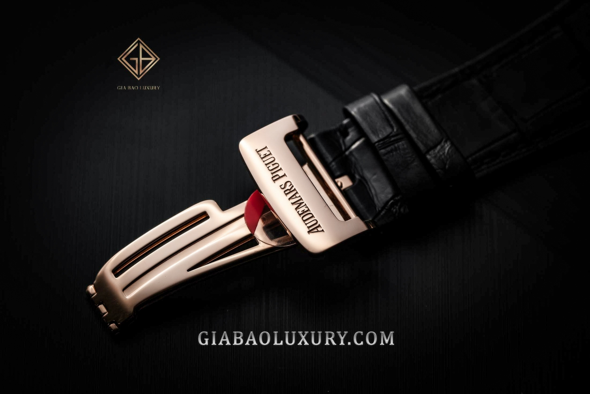 So với những người anh em có cùng mã hiệu, chiếc đồng này sở hữu dây đeo da cá sấu vô cùng thoải mái và cũng là điểm nhấn khác biệt, tạo phong cách cá nhân đẳng cấp cho người đeo. Chất liệu da cá sấu cổ điển ôm sát cổ tay người đeo được cố định bởi khóa gập, bên trong có khắc hai chữ AP bằng vàng hồng là tên viết tắt của thương hiệu.
