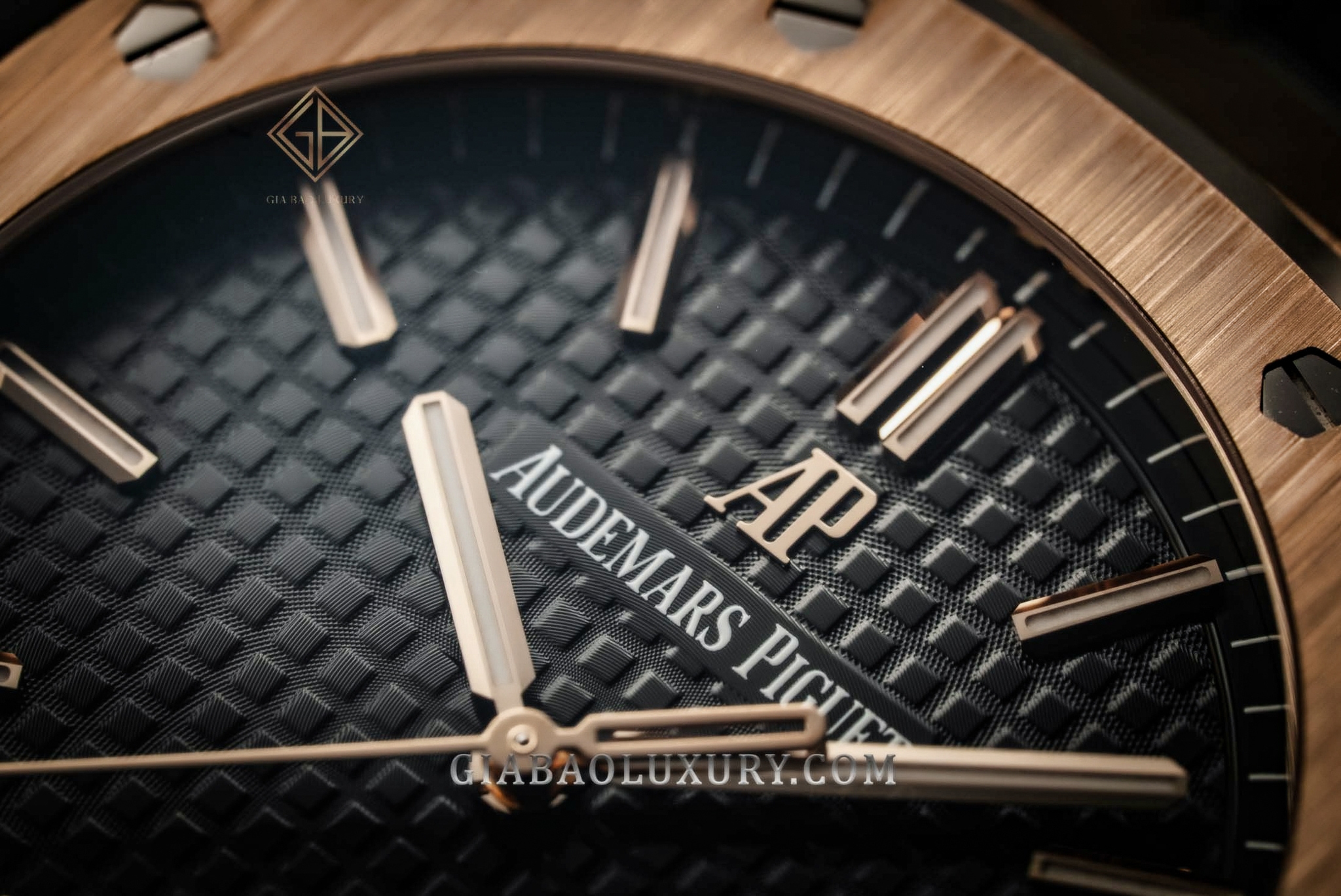 Không chỉ sở hữu bộ khung vỏ quyến rũ cùng dây đeo da mềm mại, thoải mái, tạo tác nổi bật với mặt số được chế tác theo phong cách Grande Tapisserie lộng lẫy. Những hình vuông nhỏ được dập nổi bắt sáng cực kỳ tốt cùng với những cọc số bằng vàng hồng và bộ kim Royal Oak được phủ chất phát quang khiến đồng hồ có thể nổi bật ở mọi góc nhìn, trong mọi môi trường ánh sáng khác nhau. Với hình dáng thuôn dài bo góc và một vạch phát quang ở chính giữa, thiết kế bộ kim và cọc số đã trở thành biểu tượng riêng của dòng sản phẩm Audemars Piguet Royal Oak.