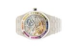 Để bắt đầu với chiếc đồng hồ này, có lẽ chúng ta nên đề cập tới chi tiết đầy màu sắc trước tiên. Vành bezel bát giác quen thuộc của dòng Royal Oak đã được làm mới hoàn toàn, với 32 viên Sapphire có màu trải dài theo tông màu của cầu vồng. Chúng ta sẽ đi qua đủ sắc màu như đỏ, cam, vàng, lục, lam, chàm, tím…