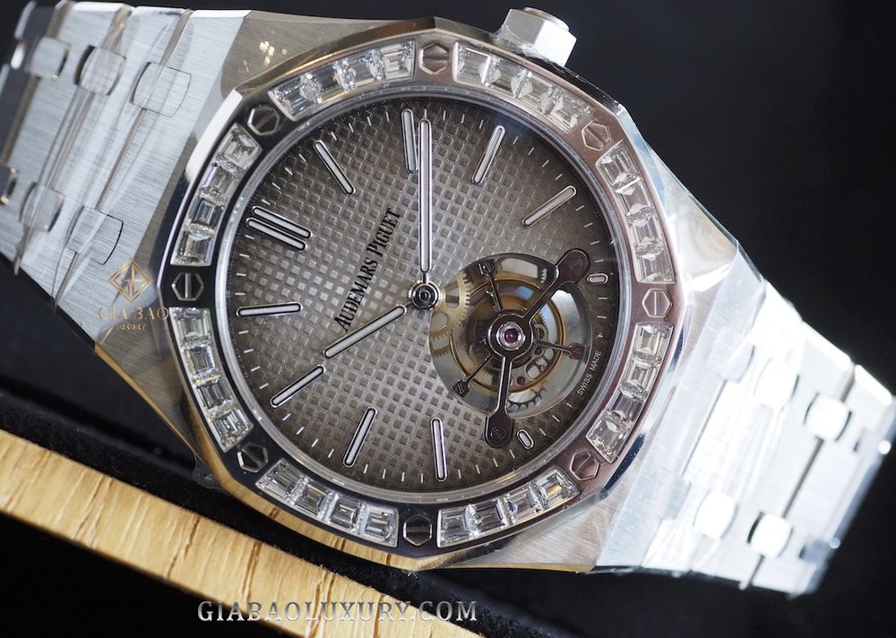 Không chỉ được làm từ kim loại hiếm, Royal Oak Tourbillon Extra-Thin 26516PT.ZZ.1220PT.01 còn gây ấn tượng với người hâm mộ bởi vành bezel hình bát giác được đính 32 viên kim cương hình baguette. Sẽ rất tuyệt nếu các quý ông kết hợp Royal Oak Tourbillon Extra-Thin 26516PT.ZZ.1220PT.01 cùng với những bộ vest sang trọng.