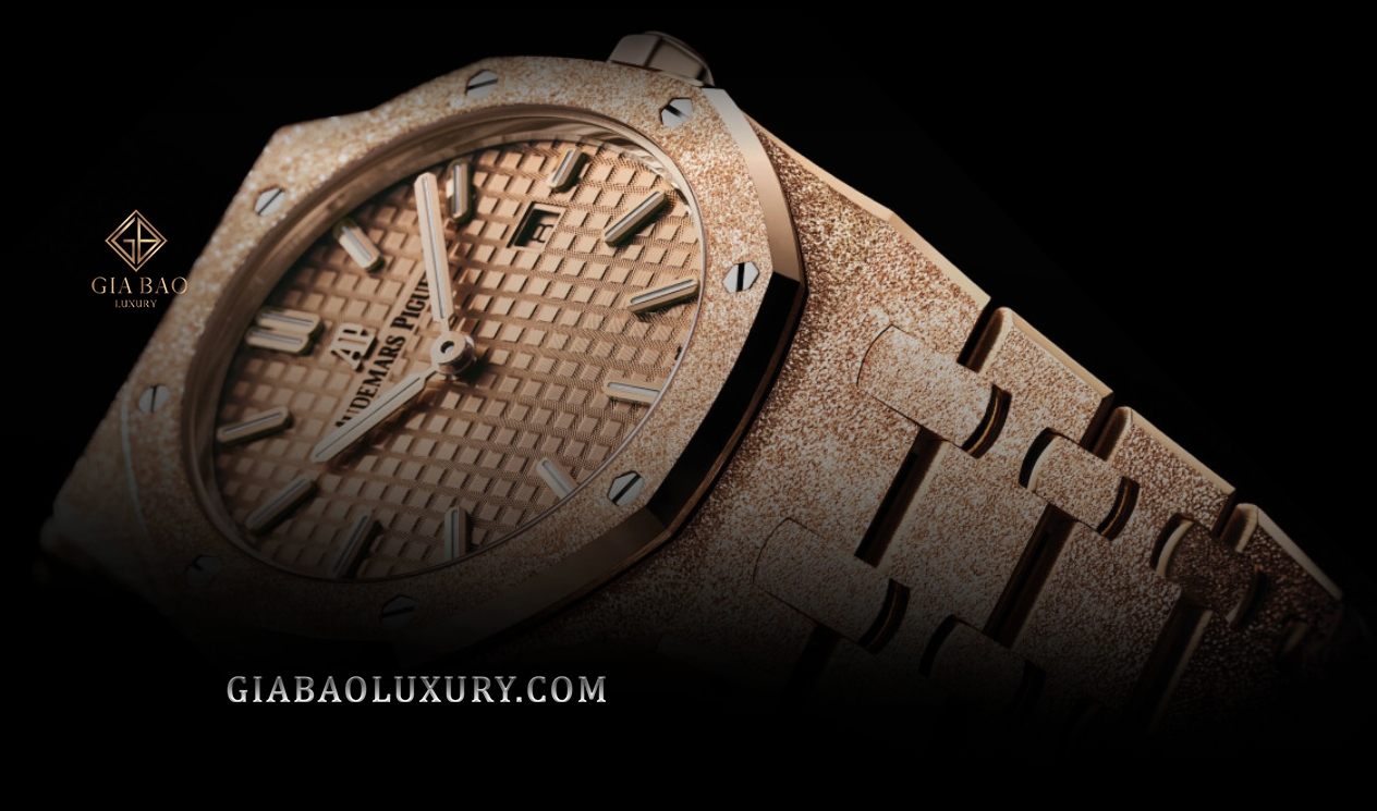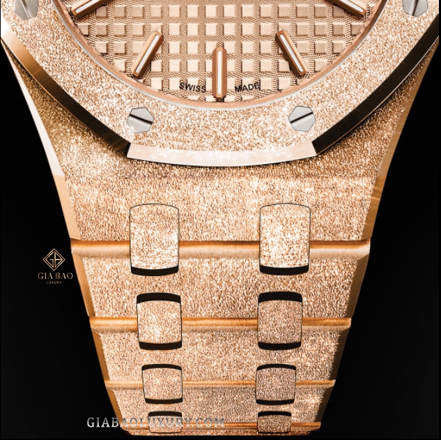 Bên cạnh bề mặt phủ bụi satin lấp lánh, chiếc đồng hồ này còn sở hữu những cạnh vát đánh bóng hoàn hảo tạo hiệu ứng ánh sáng tuyệt vời. Liên kết chặt chẽ, liền khối với lớp vỏ là dây đeo đồng hồ cùng chất liệu càng tăng thêm sự thống nhất hoàn hảo cho tạo tác khi hoàn thiện. Bên cạnh đó, sự xuất hiện của núm điều chỉnh xoắn vít còn góp phần củng cố khả năng chống thấm nước hiệu quả của Audemars Piguet Royal Oak 67653OR.GG.12630R.02 ở độ sâu 50m.