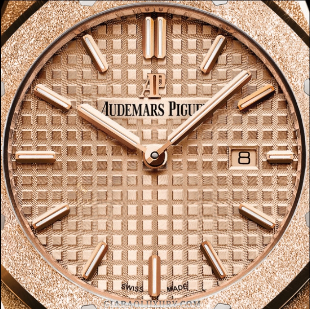 Bao bọc trong lớp vỏ cứng cáp cùng lớp kính sapphire trong trẻo, mặt số Audemars Piguet Royal Oak 67653OR.GG.12630R.02 lộng lẫy hoa văn Grande Tapisserie được chạm khắc tinh xảo là những ô vuông đính nổi đều đặn. Cùng với hệ thống cọc chỉ giờ và hai kim trung tâm dáng baton đơn giản nhưng không kém phần tinh tế, chiếc đồng hồ hứa hẹn là món phụ kiện khiến quý cô tỏa sáng mọi lúc mọi nơi. Bên cạnh đó, phiên bản này còn được trang bị ô cửa sổ báo ngày góc 3 giờ nhỏ nhắn có khả năng nhảy lịch chính xác giúp người dùng có thể theo dõi thời gian một cách trọn vẹn.