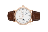 Bao bọc trong lớp vỏ chống thấm nước ở độ sâu 30m cùng mặt kính sapphire chống trầy xước là mặt số nền trắng trang bị rất nhiều bộ hiển thị thời gian hữu ích. Đó là bộ đếm thời gian thông thường với hệ thống cọc số là chữ số La Mã màu đen được điều khiển bằng bộ kim bằng vàng hồng trung tâm với hai kim giờ phút được thiết kế hình lá lúa rỗng ở giữa. Vị trí 12 giờ là mặt số phụ đếm múi giờ kép được làm từ vàng hồng với các chữ số Ả Rập góc 3, 6, 9 và 12 xen kẽ với các cọc chỉ giờ nét sổ. Góc 9 giờ trên mặt số chính là lịch báo ngày đêm được điều khiển bằng chiếc kim xanh nhỏ nhắn chạy qua Mặt Trời, Mặt Trăng và các vì sao thể hiện thời gian ngày - đêm một cách chính xác. Giữa góc 4 và 5 giờ là cơ chế tính thời gian đặc biệt được điều khiển qua núm điều chỉnh, cụ thể chữ T là “time” còn D là “ngày”. Tất nhiên, nhà sản xuất cũng không quên trang bị ô cửa báo ngày khiêm tốn ở góc 6 giờ với nền trắng, chữ số đen rõ nét.