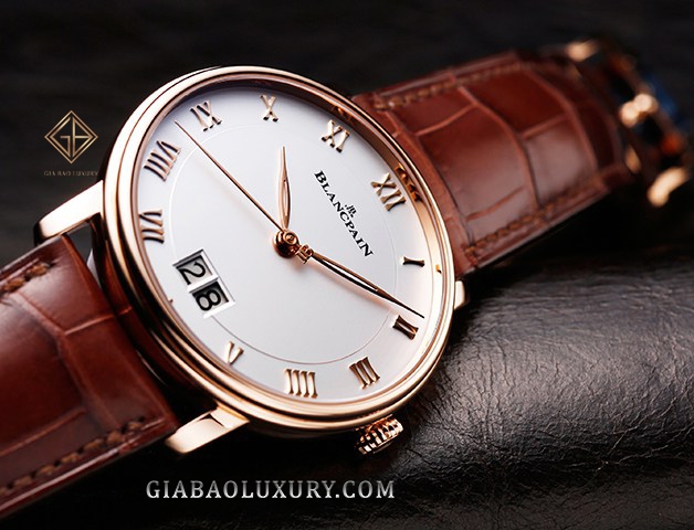 Mặt số màu trắng bạc opaline làm nền cho các cọc số dáng La Mã phía ngoài viền hiện lên rõ ràng, bộ kim chỉ giờ phút giây hình dạng lá lúa đẹp đẽ tất cả đều hiện lên bởi màu vàng hồng 18k sang trọng. Phía trên góc 12h là tên thương hiệu Blancpain, góc 6h là ô cửa sổ báo lịch ngày với 2 ô to rõ.