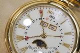 Mặt số đồng hồ được thiết kế thanh lịch nhưng có rất nhiều chi tiết, do phải hiển thị đầy đủ lịch Thứ/Ngày/Tháng cùng với Lịch tuần trăng. Mặt số trắng ngà với những chi tiết bằng vàng khối được hoàn thiện rất tỉ mỉ, kết hợp hoàn hảo với bộ kim đầu đỏ, cũng được làm từ vàng vàng.
