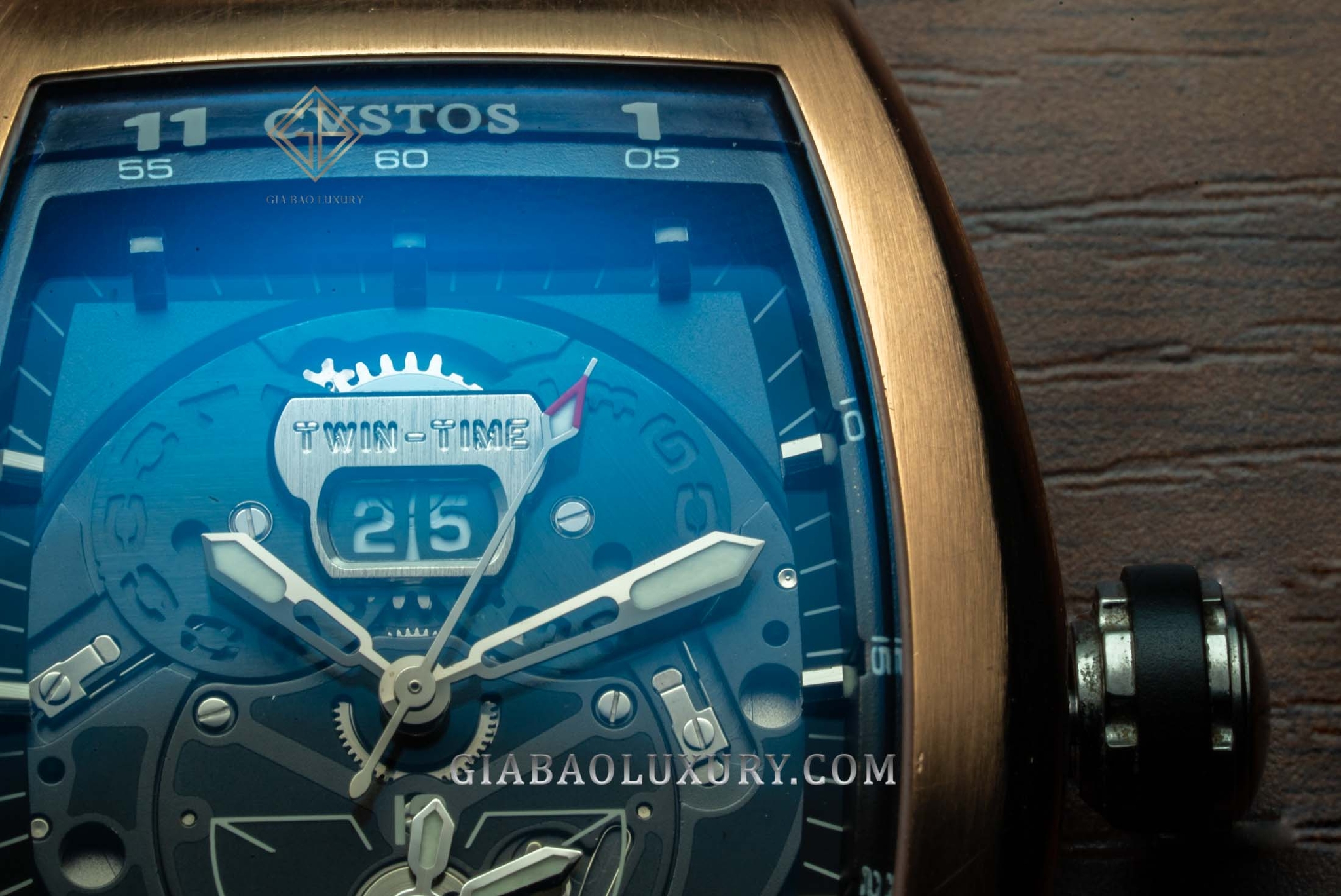 Tại sao lại là 5 kim? Những chiếc đồng hồ cơ bản sẽ có ba kim là kim giờ, phút và giây, còn với CVSTOS Challenge Twin-Time CTT RGR do có thêm chức năng báo múi giờ thứ hai nên nhà sản xuất tích hợp thêm hai kim đặt bên dưới. Ba kim chính đặt ở trung tâm mặt số sẽ chuyển động quanh vòng đếm giờ và phút tích hợp bên ngoài rìa mặt số, còn hai kim còn lại có một bộ hiển thị riêng.
