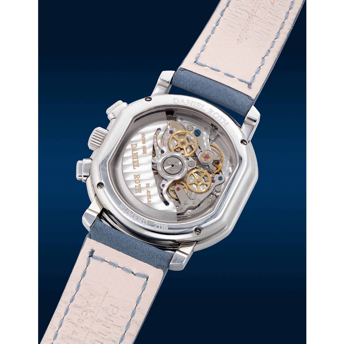 Phía trên mặt số, các kim màu xanh rực, gợi nhớ đến kim “pomme évidée” (hoặc đơn giản là “kim Breguet”) nhưng theo phong cách mũi tên Roth cổ điển, là điểm nhấn tuyệt vời cho toàn bộ mặt số. Chiếc đồng hồ hiện tại còn sở hữu bộ máy DR500 dựa trên bộ chuyển động Zenith El Primero nổi tiếng, cũng được sử dụng cho chiếc Rolex Daytona đầu tiên. May mắn thay, mặt sau trong suốt cho phép người ta chứng kiến toàn bộ máy.