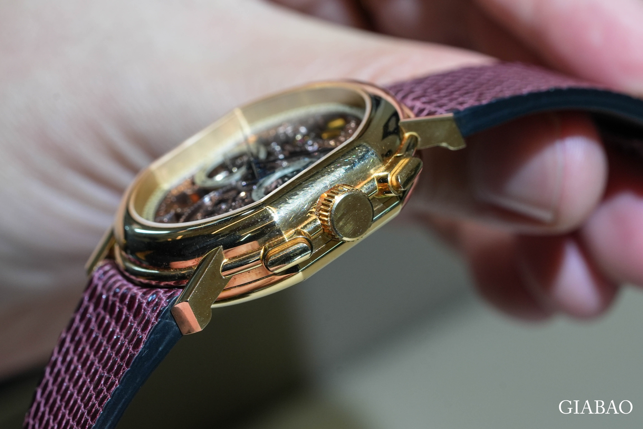Mặt số phía trước hiển thị giờ và phút với các chữ số La Mã nằm trên tấm kính trong suốt màu xám. Vỏ và các chữ số bằng vàng hồng cộng hưởng với các kim đồng hồ màu xanh lam, tạo ra màu sắc tuyệt vời của rượu sâm panh và màu đồng trên mặt số bằng thủy tinh.