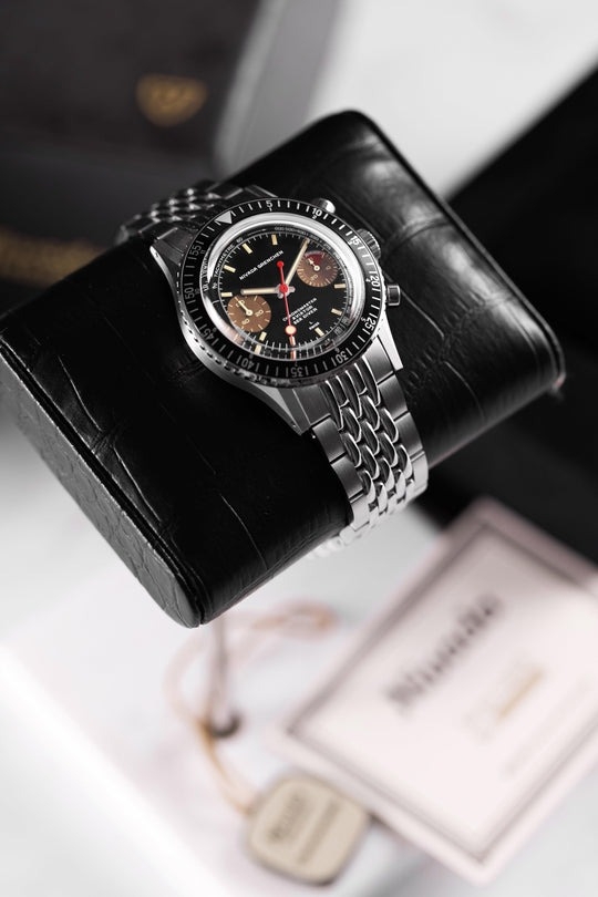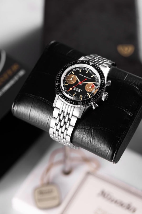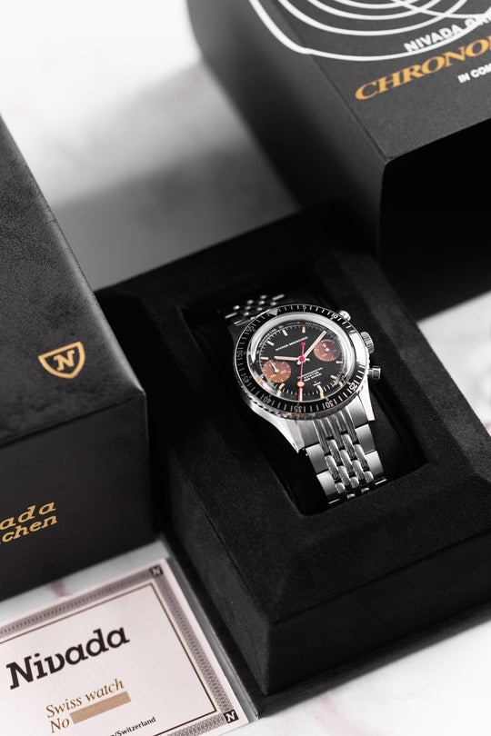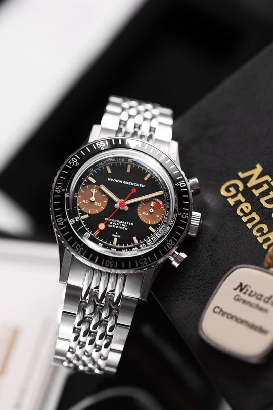 Nhắc đến những mẫu đồng hồ thể thao mang hơi thở hoài cổ, Nivada Grenchen là một trong những thương hiệu Thụy Sĩ được giới mộ điệu đánh giá cao. Thương hiệu này nổi tiếng với việc tái hiện những thiết kế cổ điển, nhưng vẫn giữ được tính ứng dụng trong cuộc sống hiện đại. Dòng Chronomaster chính là đại diện tiêu biểu cho sự giao thoa ấy, khi kết hợp bộ máy cơ học bền bỉ với phong cách thiết kế mang đậm dấu ấn “vintage.” Mẫu Nivada Grenchen Chronomaster Lollipop Honey (Ref: 85008M), với mặt số đen (size 38mm) và tông “Honey” đặc trưng trên các mặt số phụ, là minh chứng rõ ràng cho triết lý này.