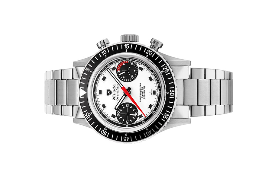 Vỏ và dây đồng hồ bằng thép không gỉ (316L) thể hiện độ bền, khả năng chống ăn mòn, và vẻ sáng bóng khó phai. Thép 316L được xem như chất liệu “tiêu chuẩn” trong ngành đồng hồ, phù hợp cho cả môi trường công sở lẫn các hoạt động thường ngày. Từng mắt dây, từng góc cạnh trên vỏ được Nivada Grenchen chăm chút, mang đến cảm giác chắc chắn nhưng vẫn đủ tinh tế. Sự kết hợp giữa tông trắng của mặt số và lớp thép 316L sáng bóng càng làm nổi bật tinh thần thể thao cổ điển của dòng Chronomaster.