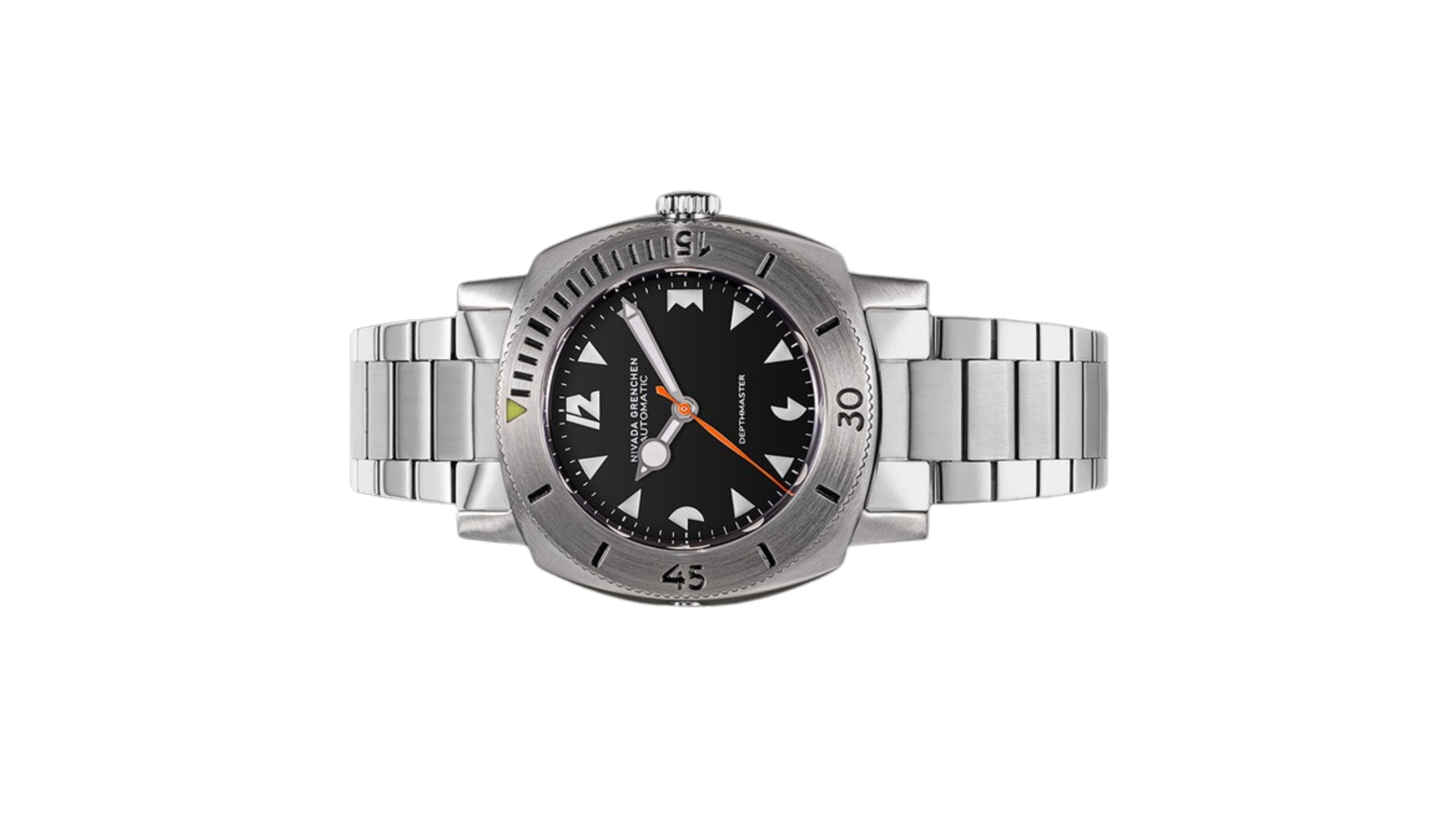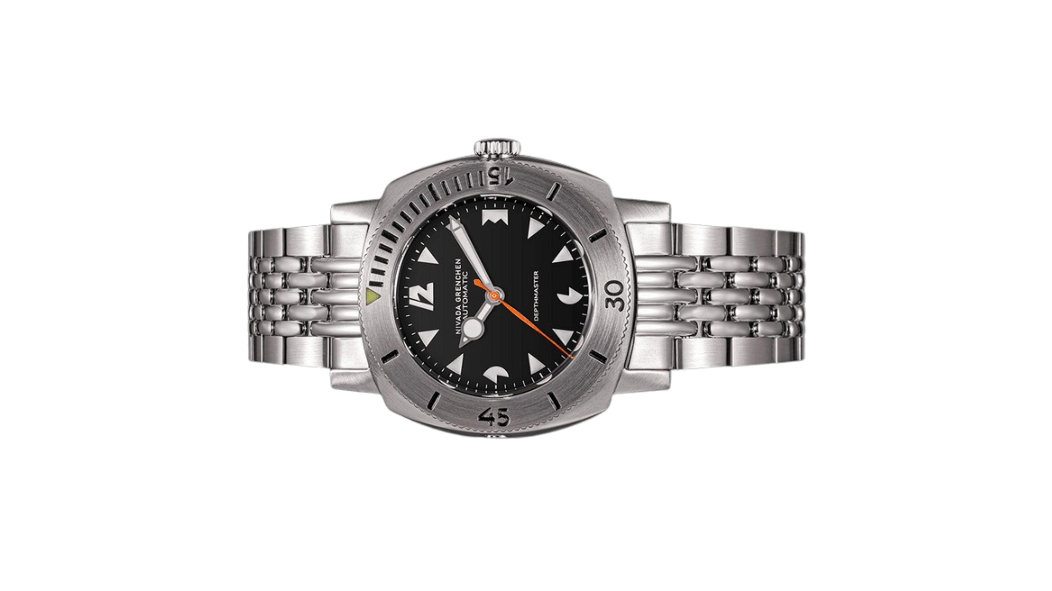 Đồng hồ đeo tay thương hiệu Nivada Grenchen, dòng sản phẩm Depthmaster, Ref number: 14102A, mặt số đen, size 39mm, máy tự động, vỏ và dây đồng hồ bằng thép không gỉ 316, mới 100%