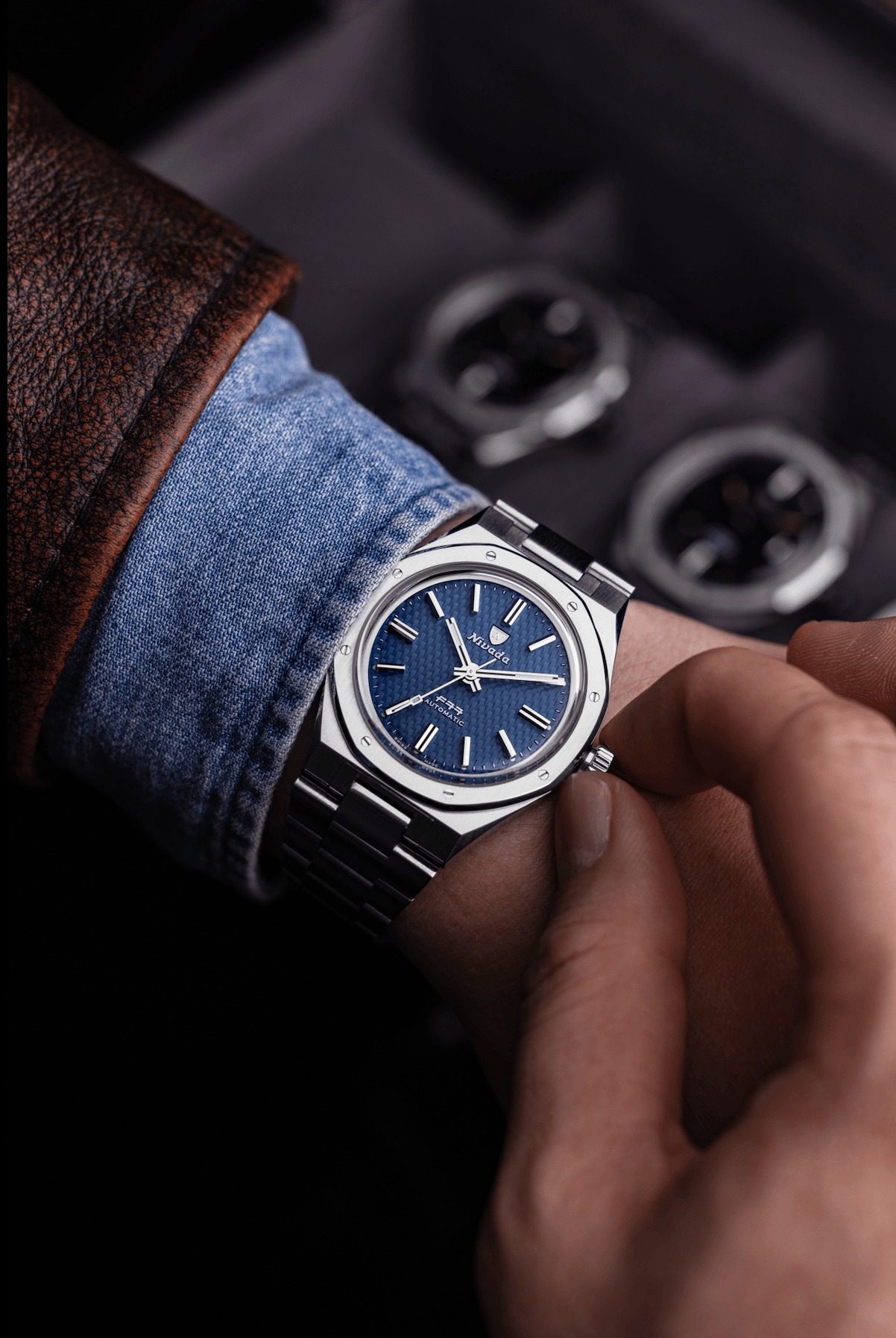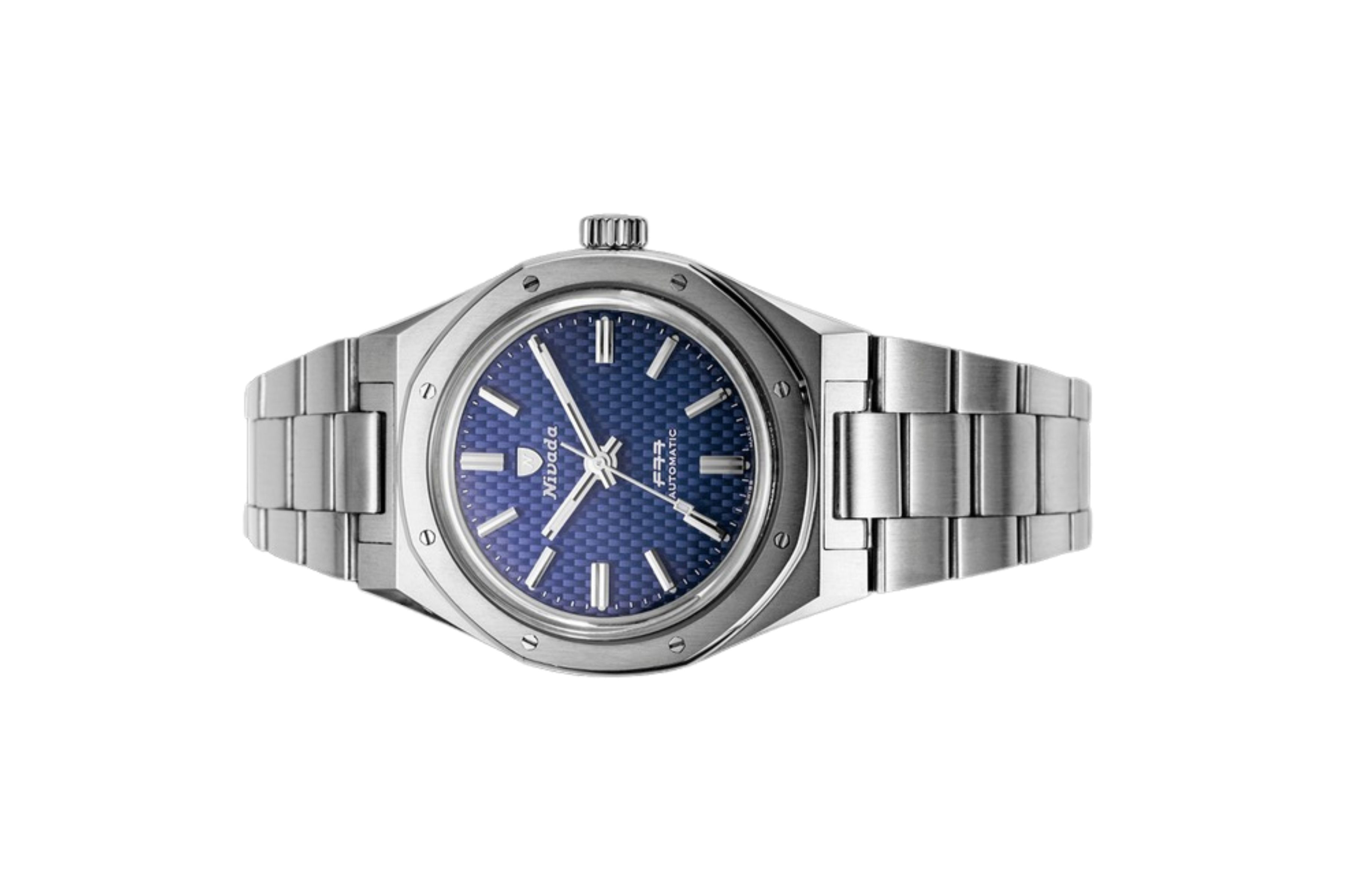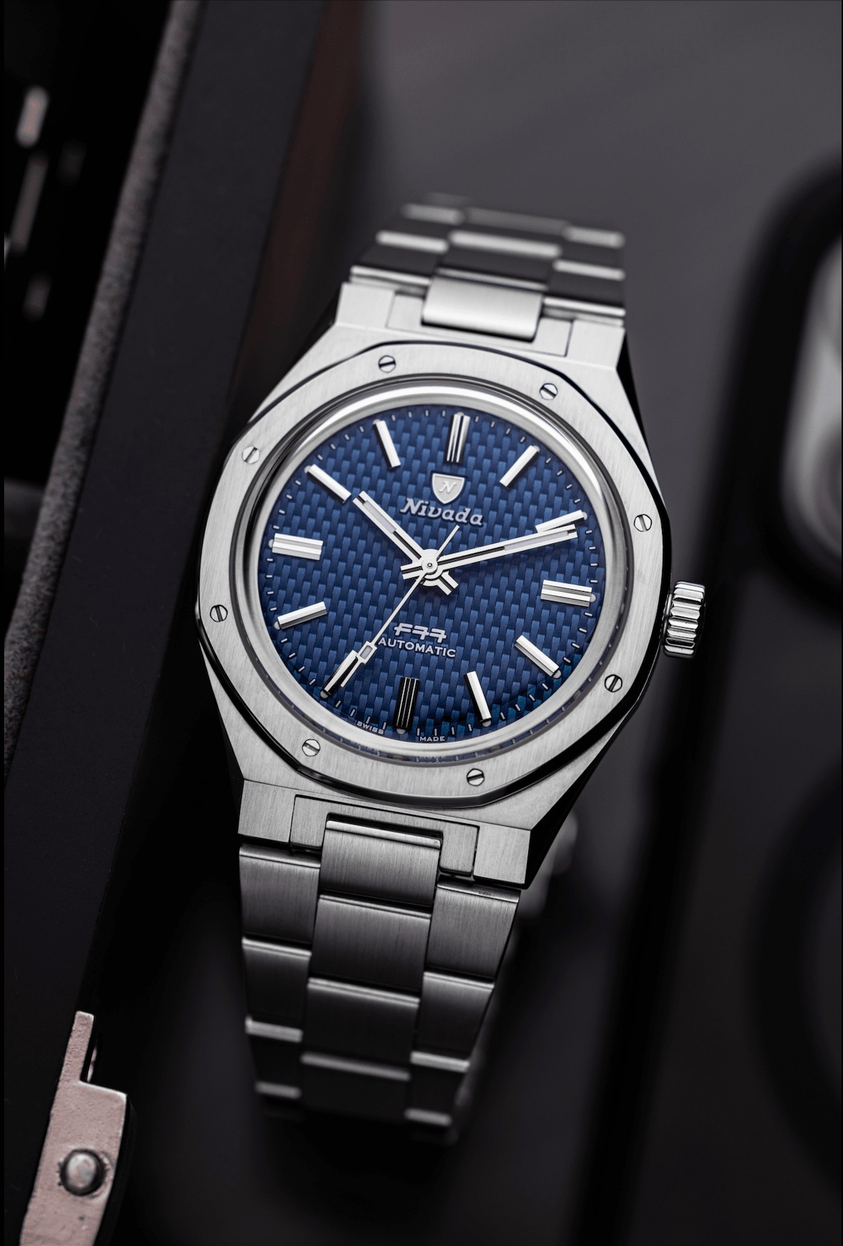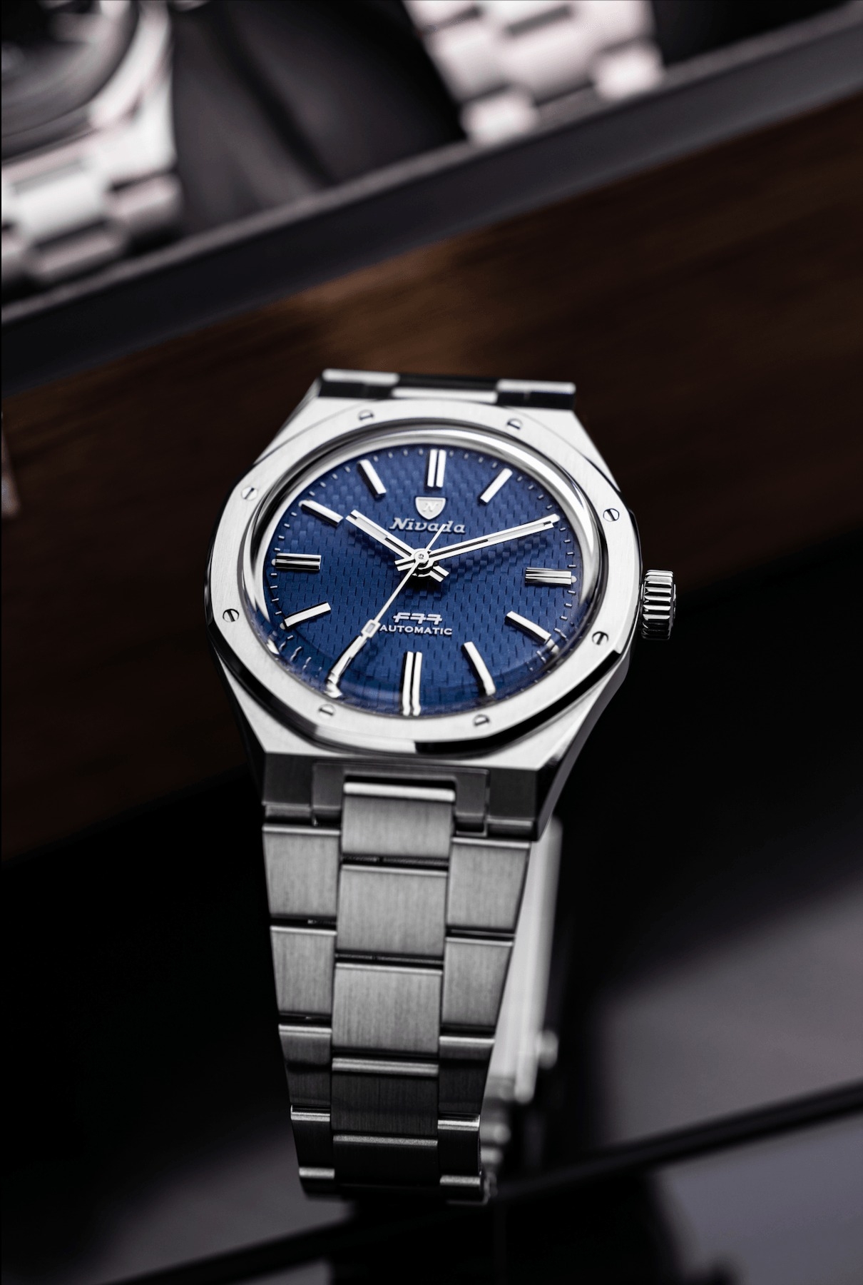 Vỏ và dây đồng hồ bằng thép không gỉ (316L) là lựa chọn hoàn hảo để khẳng định độ bền, khả năng chống ăn mòn và vẻ sáng bóng qua nhiều năm sử dụng. Thép 316L được xem là “tiêu chuẩn” trong ngành đồng hồ, đáp ứng tốt cả môi trường công sở lẫn những hoạt động thường ngày. Bên cạnh đó, từng mắt dây, góc cạnh trên vỏ được Nivada Grenchen trau chuốt, tạo cảm giác chắc chắn nhưng vẫn giữ được nét thanh lịch khi cầm trên tay. Sự kết hợp giữa màu xanh họa tiết trên mặt số và ánh thép 316L mang lại tổng thể hài hòa, hiện đại, đồng thời duy trì tinh thần tối giản mà dòng F77 hướng đến.