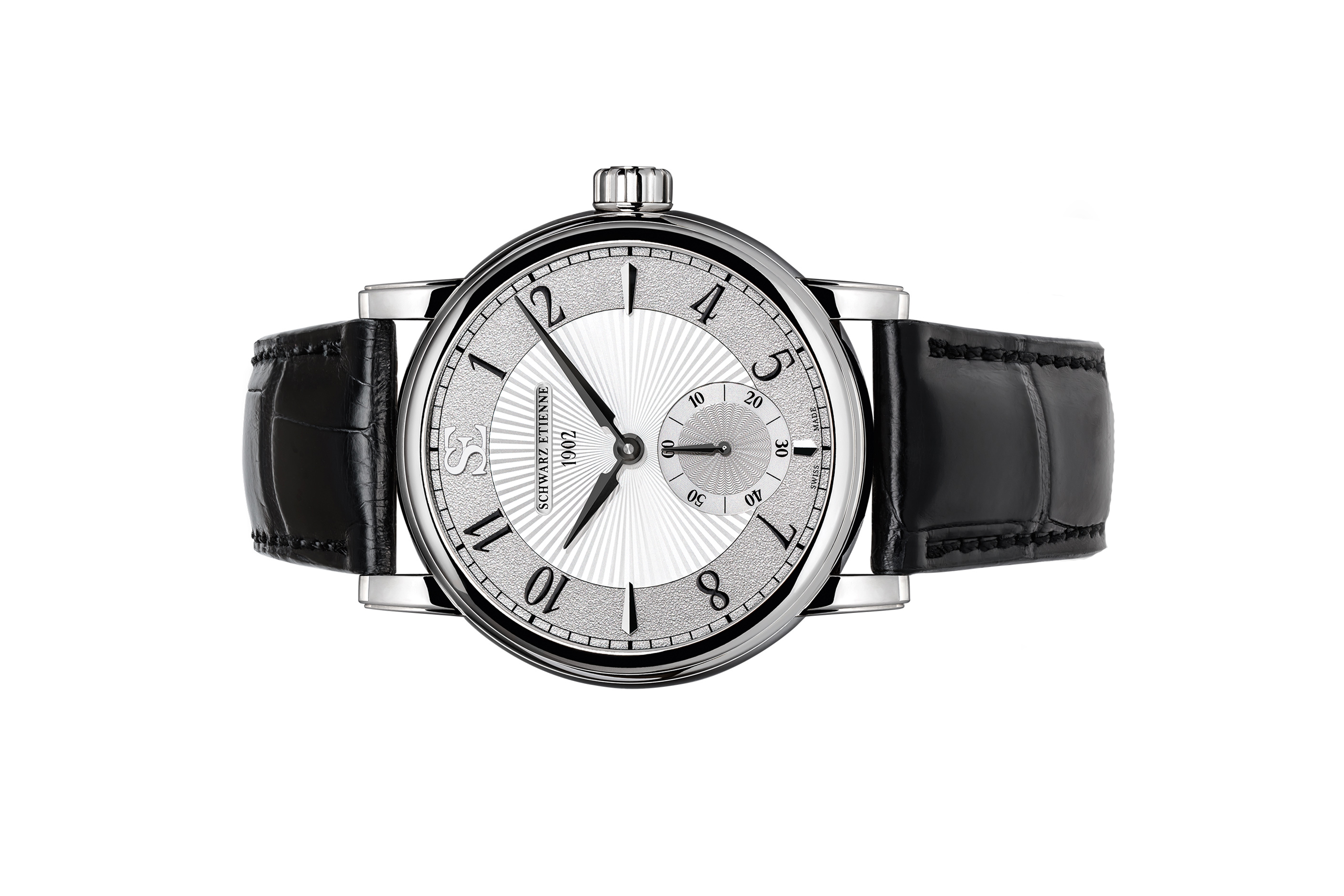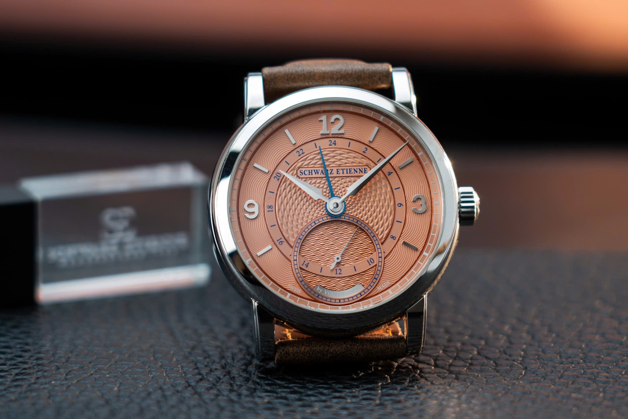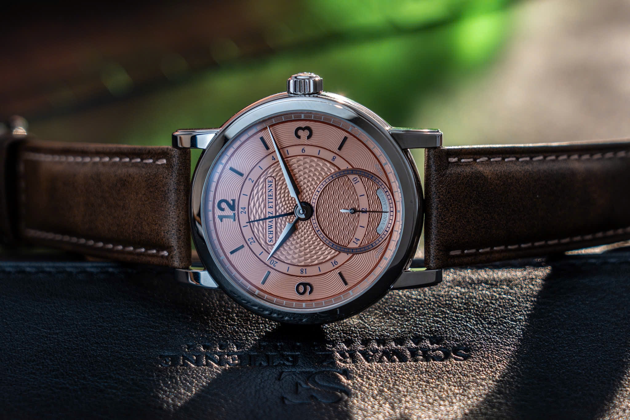 Để tô điểm cho phần mặt số rực rỡ, Schwarz Etienne chọn dây da nâu kiểu “aged” (giả cổ), lót bên trong màu xám, khiến đồng hồ toát lên vẻ thanh lịch mà không mất chất cổ điển. Phần khóa gập (folding buckle) bằng thép không gỉ, khắc logo Schwarz Etienne, đóng mở nhẹ nhàng và chắc chắn, giúp người đeo dễ dàng điều chỉnh sao cho ôm sát cổ tay.
