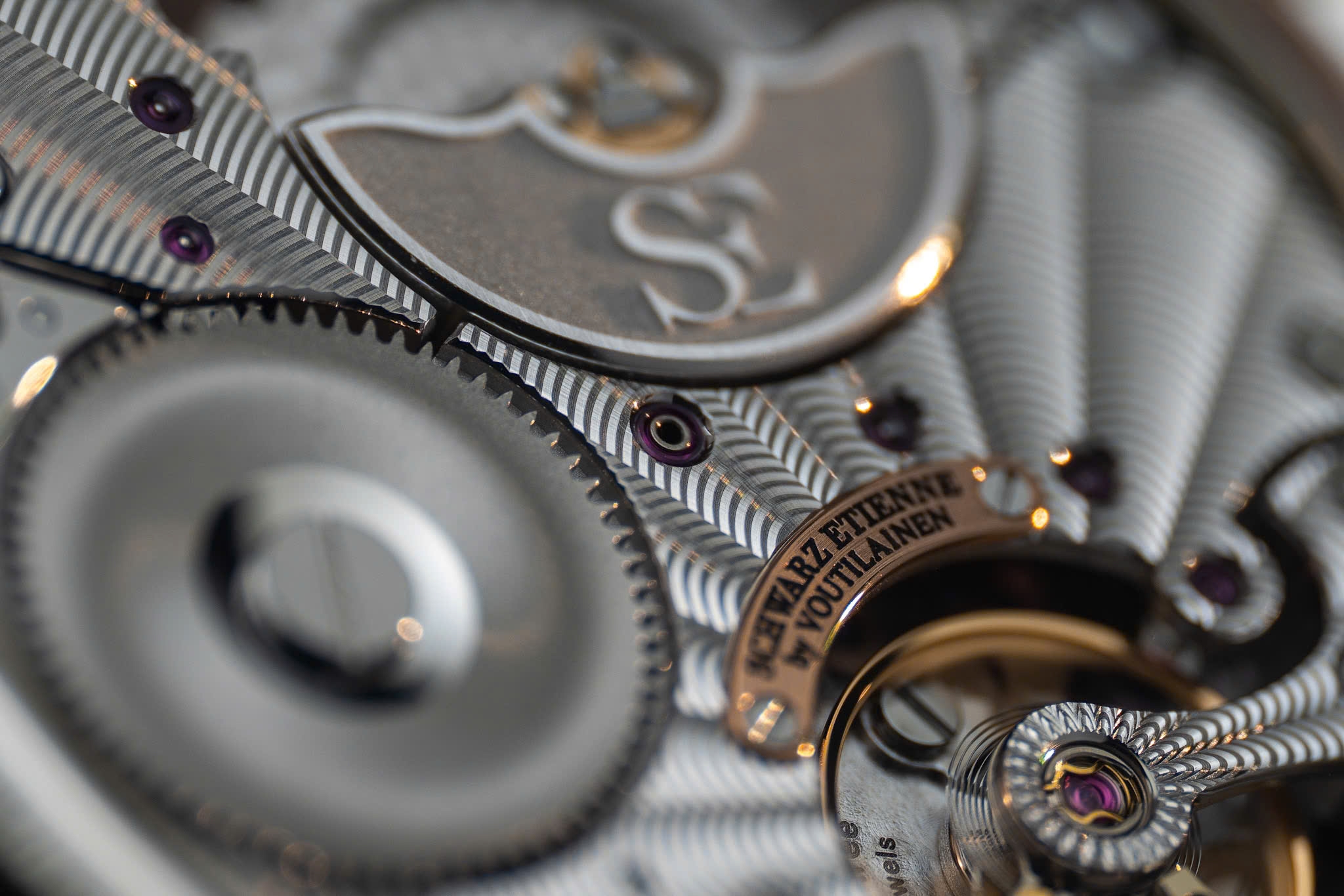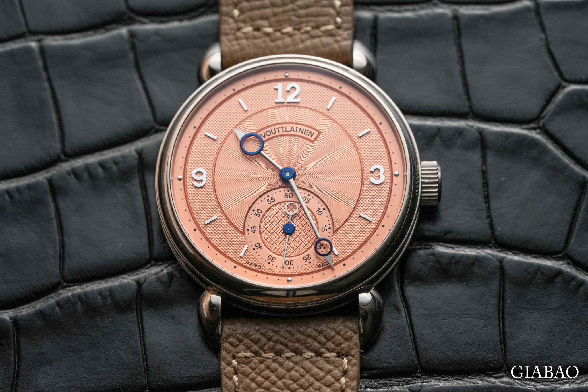 • Vùng kim giây nhỏ (small second): trang trí kiểu “vague” (lượn sóng). Bên trên mặt số, quý vị sẽ thấy dòng chữ “By Voutilainen,” khẳng định rõ dấu ấn của Kari Voutilainen. Cọc số Ả Rập màu bạc kết hợp vạch chỉ giờ, và logo Schwarz Etienne hoàn thiện tinh xảo, làm nổi bật nét trau chuốt tổng thể. Bộ kim giờ, phút dạng “lancine-style” thanh mảnh, trong khi kim GMT màu xanh dương (blued steel) mang lại điểm nhấn thể thao, tiện lợi cho người thường di chuyển hoặc làm việc cùng đa múi giờ.