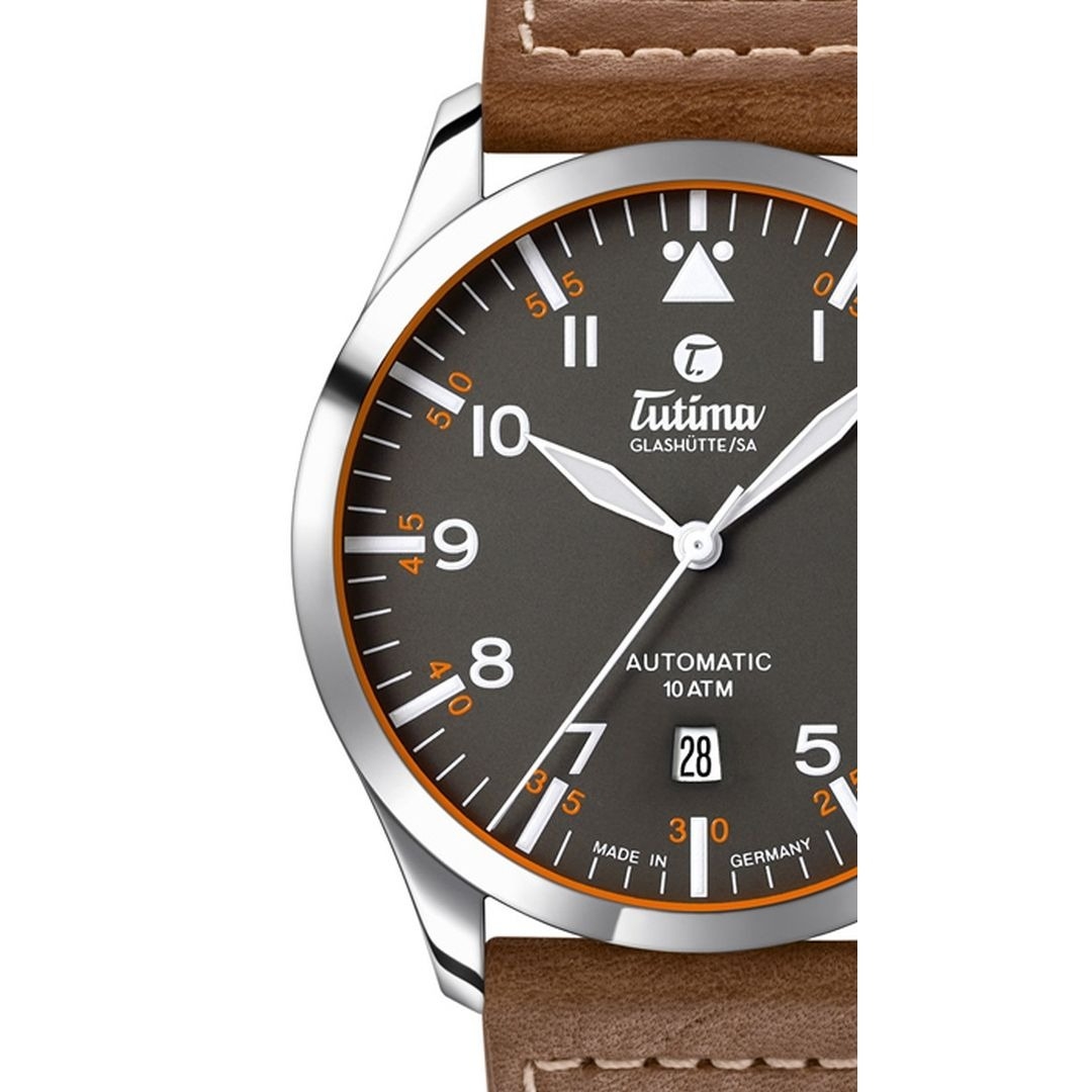 Đồng hồ đeo tay thương hiệu Tutima, dòng sản phẩm Flieger Automatic, Ref no: 6105-03, mặt số xám Gunmetal, size 41mm, máy tự động, vỏ đồng hồ bằng thép không gỉ và dây da, hàng mới 100%