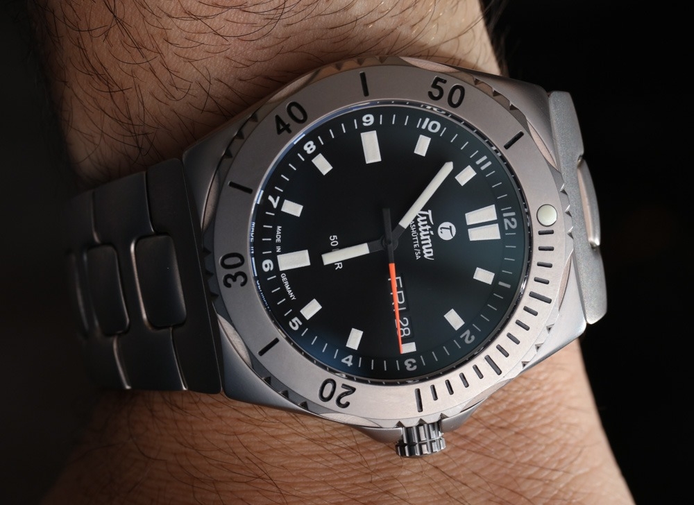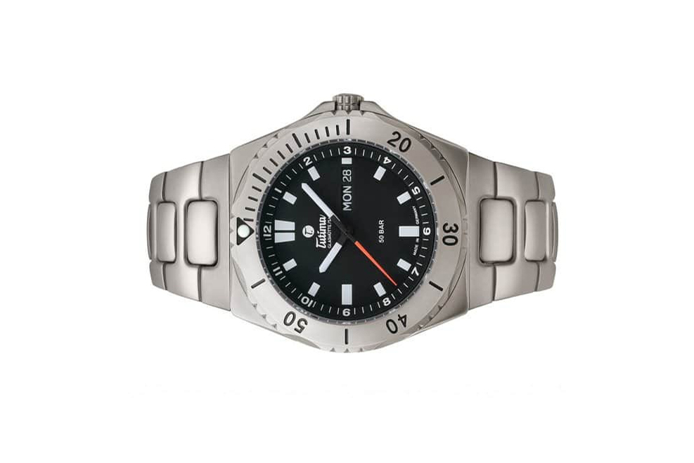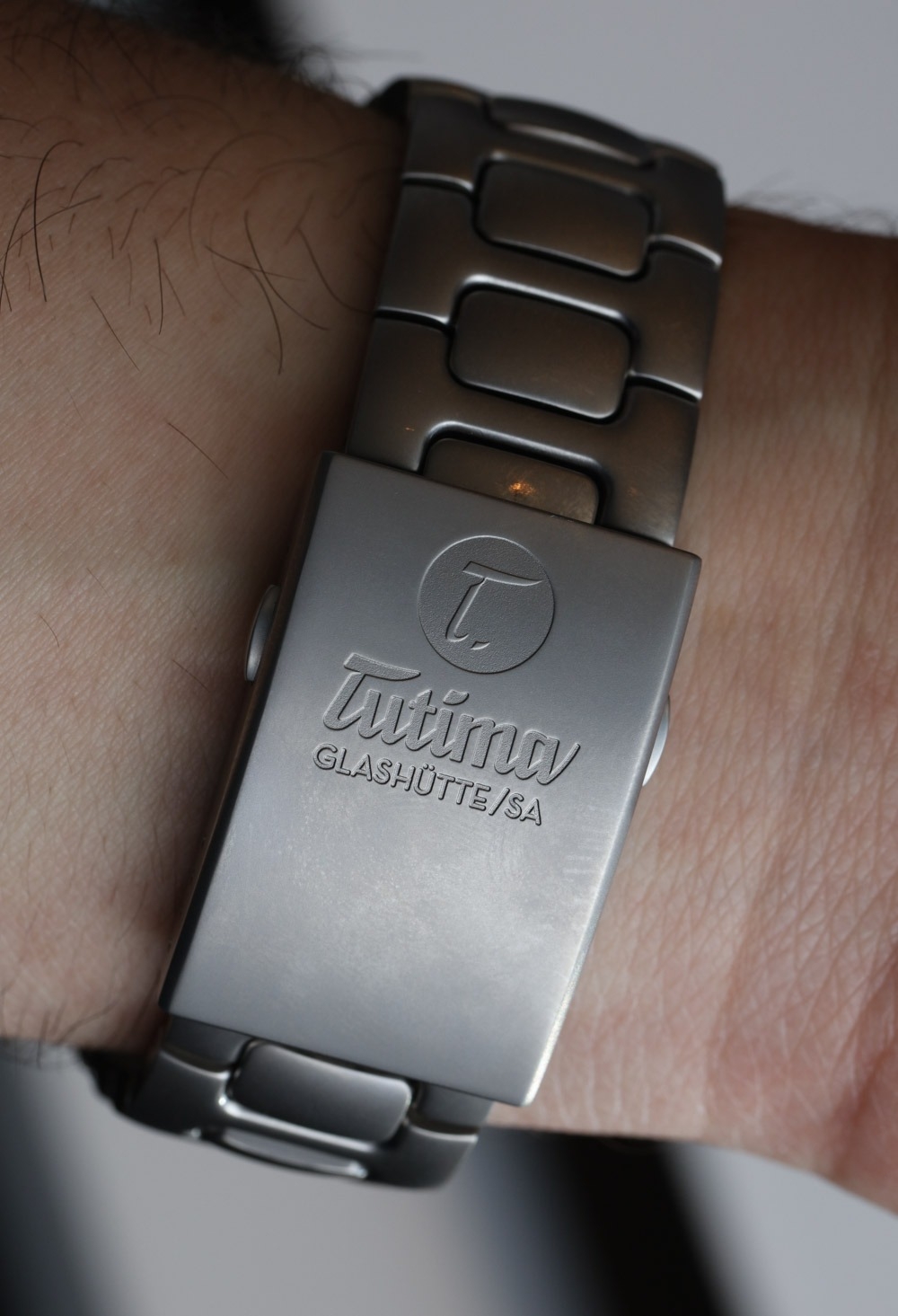 Một yếu tố không thể không nhắc đến là chất liệu titanium được Tutima lựa chọn cho cả vỏ và dây đeo. Titanium được xem như vật liệu cao cấp trong ngành đồng hồ, bởi tính bền, nhẹ, chống ăn mòn, và thân thiện với da tay. So với thép không gỉ, titanium cho cảm giác đeo êm hơn, giảm áp lực cổ tay khi sử dụng lâu, đặc biệt tiện lợi cho những ai thường xuyên hoạt động ngoài trời. Titanium cũng có màu sắc xám mờ sang trọng, hòa quyện hài hòa với mặt số nhung đen, khiến toàn bộ thiết kế trông mạnh mẽ nhưng vẫn giữ được nét tinh gọn.