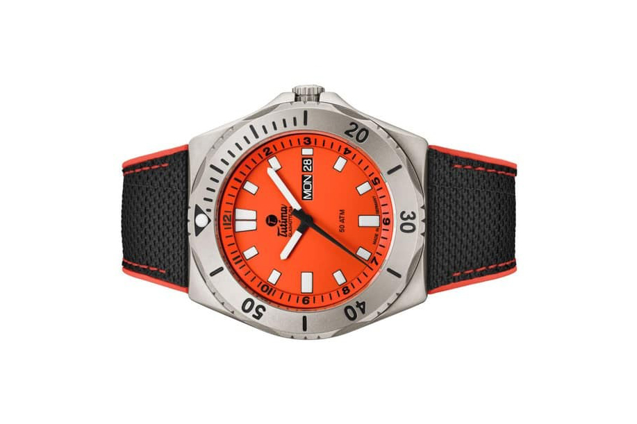 Đồng hồ đeo tay thương hiệu Tutima, dòng sản phẩm M2 Seven Seas, Ref no: 6151-07, mặt số cam Signal, size 44mm, máy tự động, vỏ đồng hồ bằng titanium và dây đeo vải Kevlar, hàng mới 100%