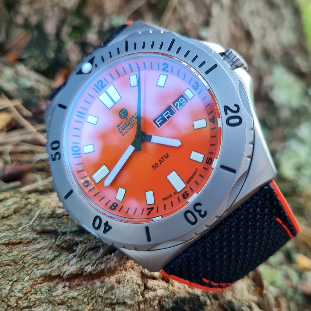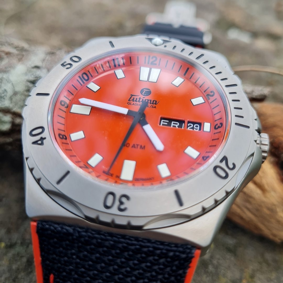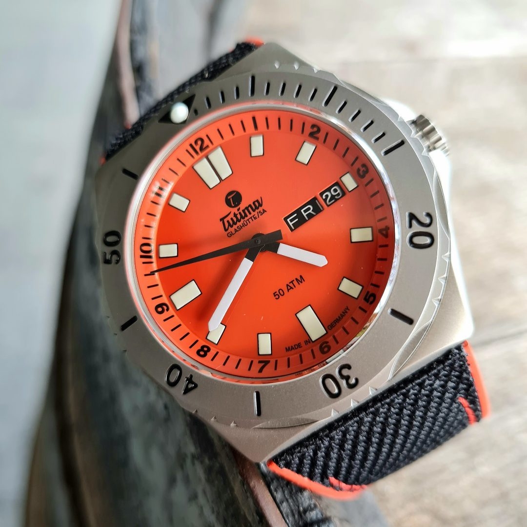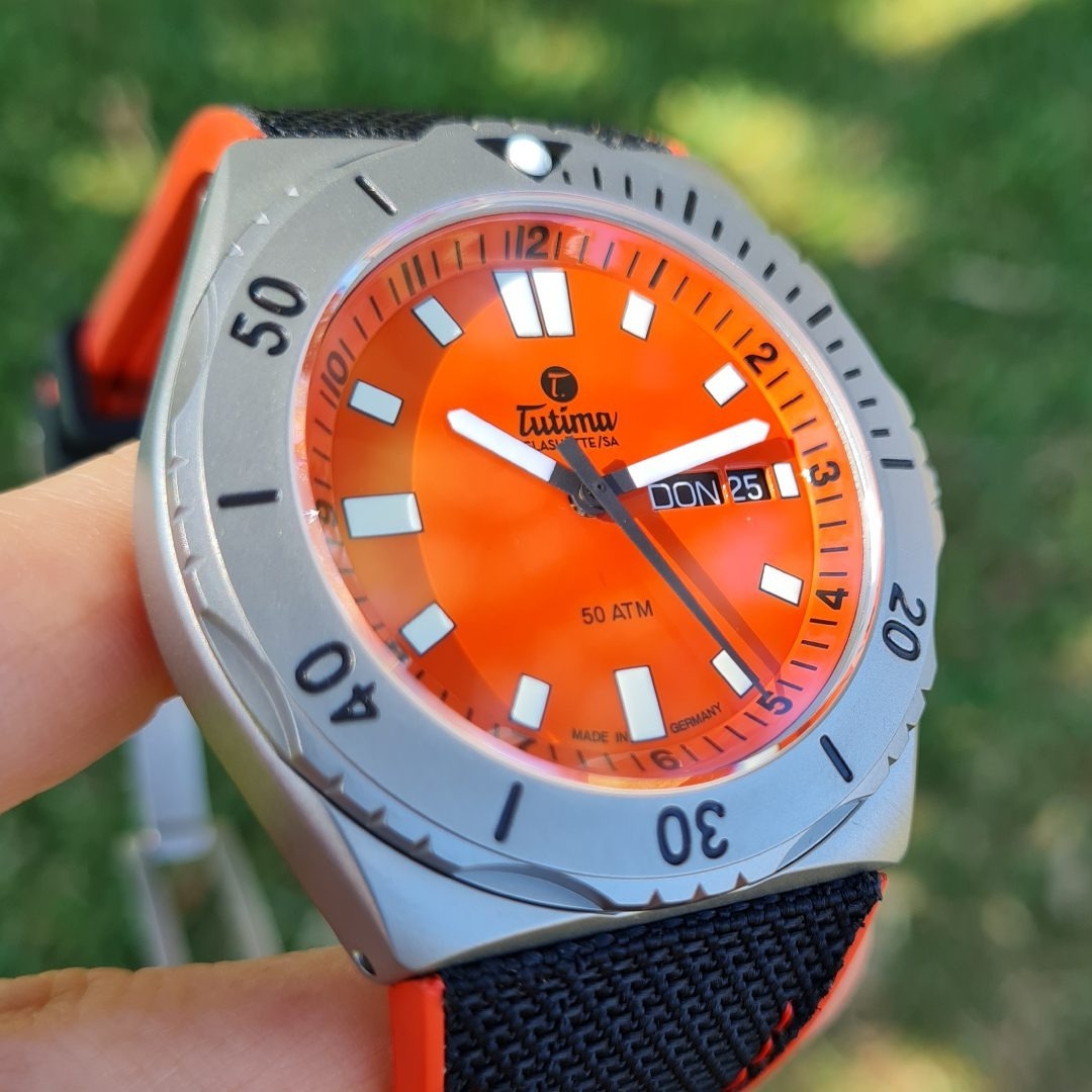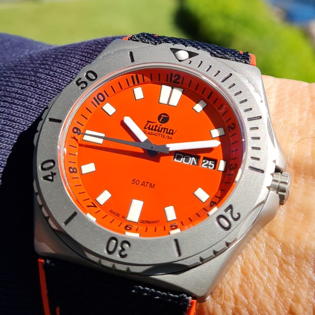 Đánh giá Đồng hồ đeo tay thương hiệu Tutima, dòng sản phẩm M2 Seven Seas, Ref no: 6151-07, mặt số cam Signal, size 44mm, máy tự động, vỏ đồng hồ bằng titanium và dây đeo vải Kevlar, hàng mới 100%