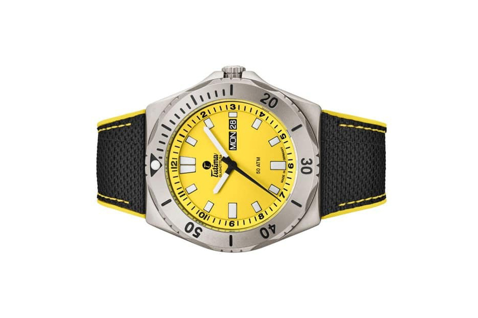 Đồng hồ đeo tay thương hiệu Tutima, dòng sản phẩm M2 Seven Seas, Ref no: 6151-09, mặt số màu vàng, size 44mm, máy tự động, vỏ đồng hồ bằng titanium và dây đeo vải Kevlar, hàng mới 100%
