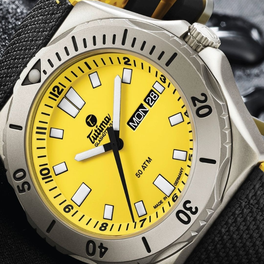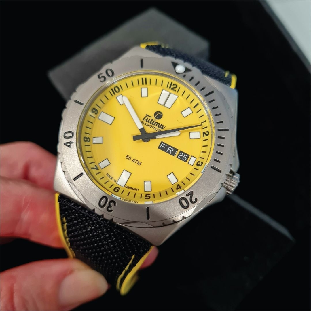 Đánh giá Đồng hồ đeo tay thương hiệu Tutima, dòng sản phẩm M2 Seven Seas, Ref no: 6151-09, mặt số màu vàng, size 44mm, máy tự động, vỏ đồng hồ bằng titanium và dây đeo vải Kevlar, hàng mới 100%
