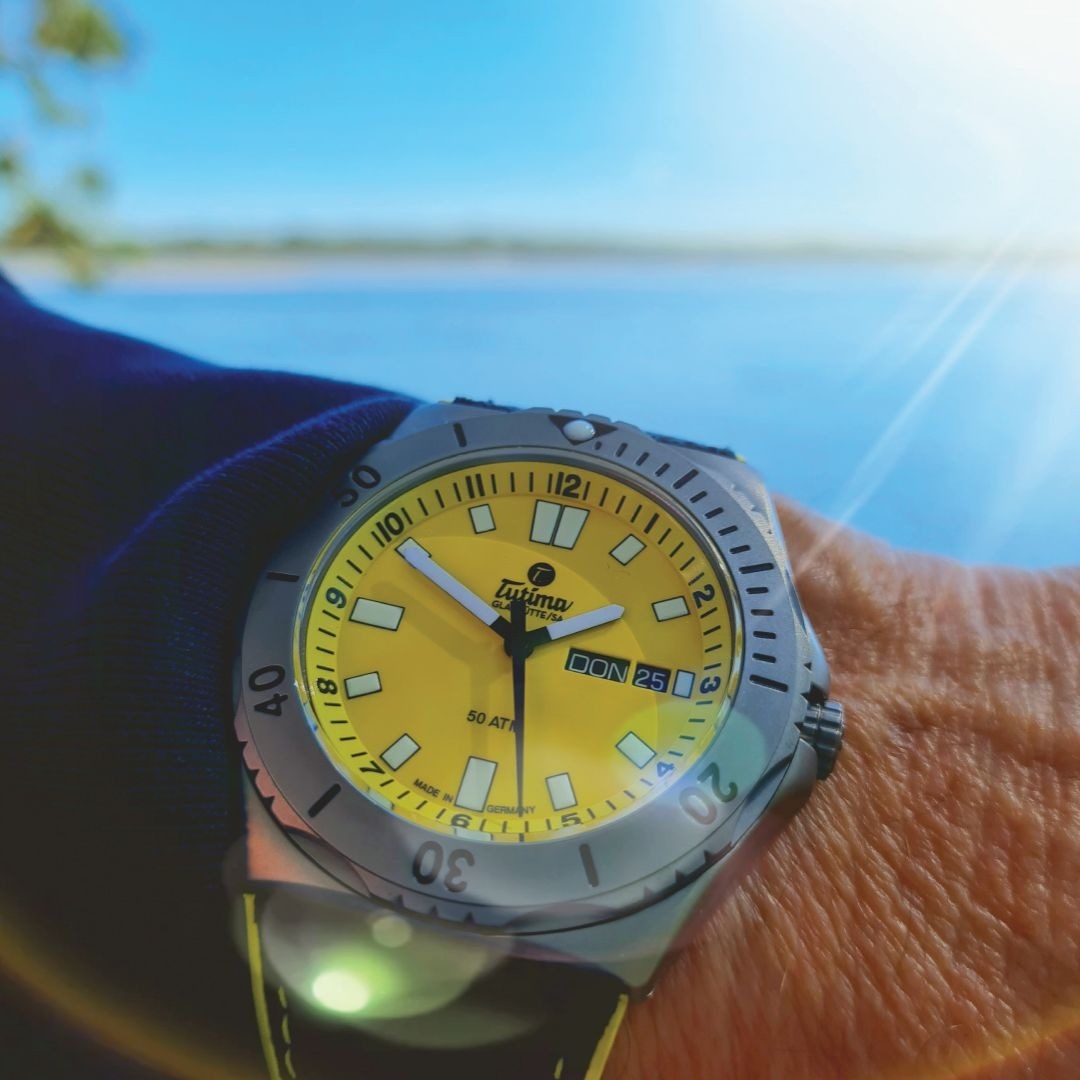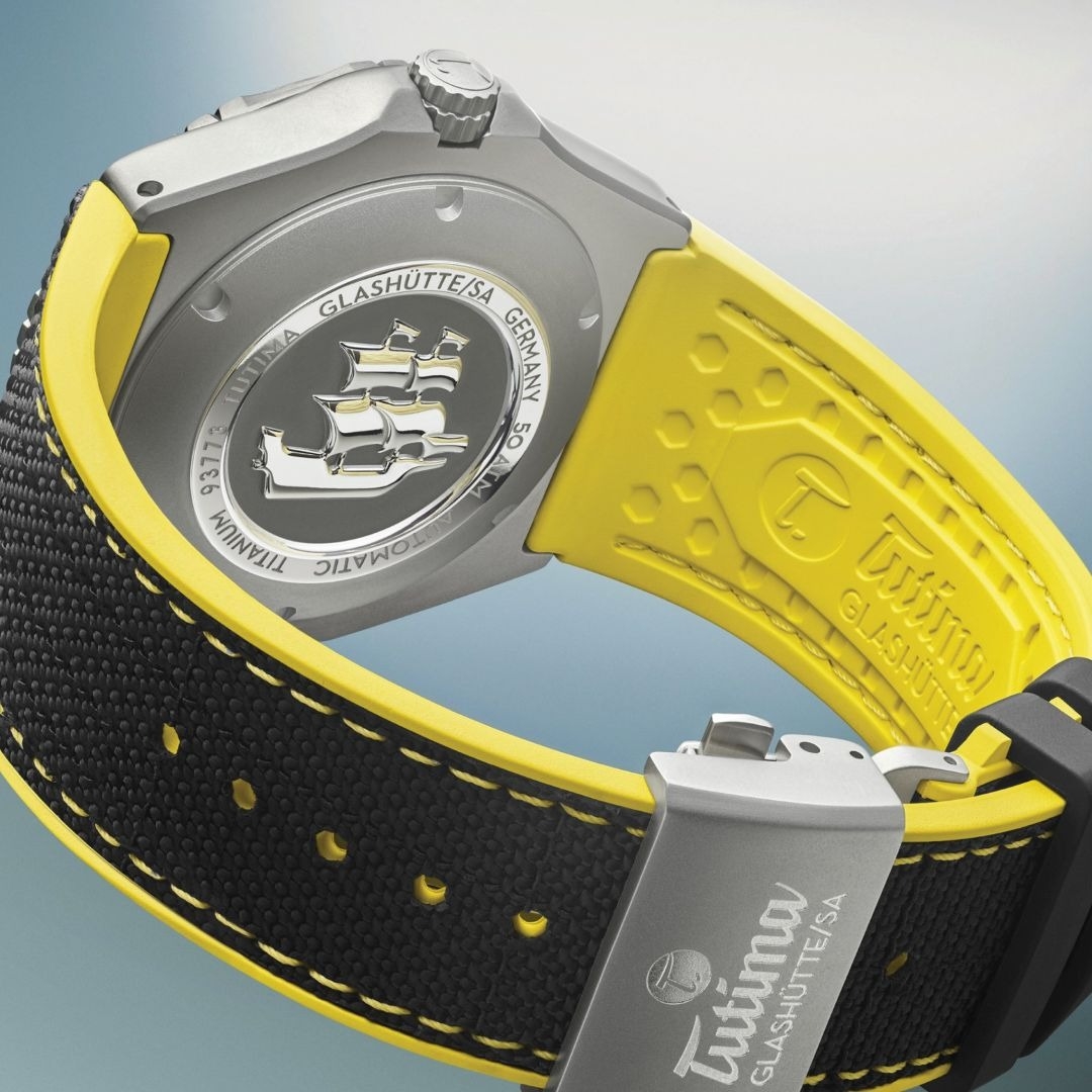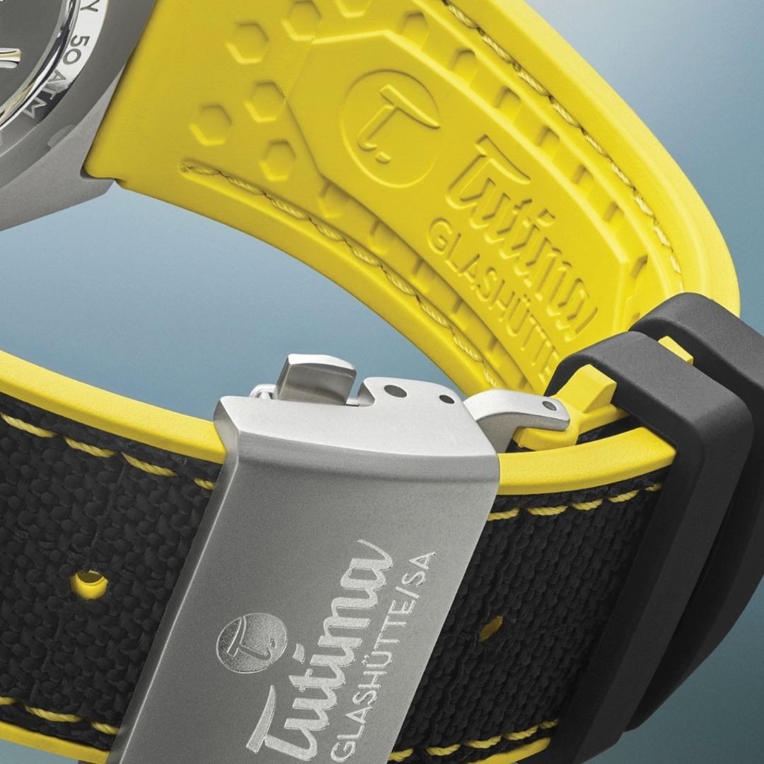 Phần mặt số vàng (44mm) tạo ấn tượng tức thì nhờ sắc màu tươi sáng, tựa như nguồn năng lượng dồi dào chực chờ bùng nổ. Gam vàng này không quá chói, vẫn giữ được độ hài hòa khi kết hợp với các chi tiết xung quanh. Các cọc số cùng kim phủ dạ quang, dây Kevlar màu đen, và vỏ titanium xám mờ tất cả tạo nên sự đối lập về tông màu, làm bật lên cảm hứng phiêu lưu. Thay vì chạy theo các gam màu “an toàn” như đen, xám hay xanh, Tutima mạnh dạn chọn sắc vàng – một tuyên ngôn rõ ràng dành cho những ai muốn khẳng định cá tính, thích nổi bật giữa đám đông.