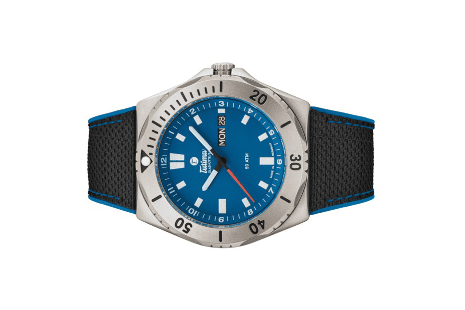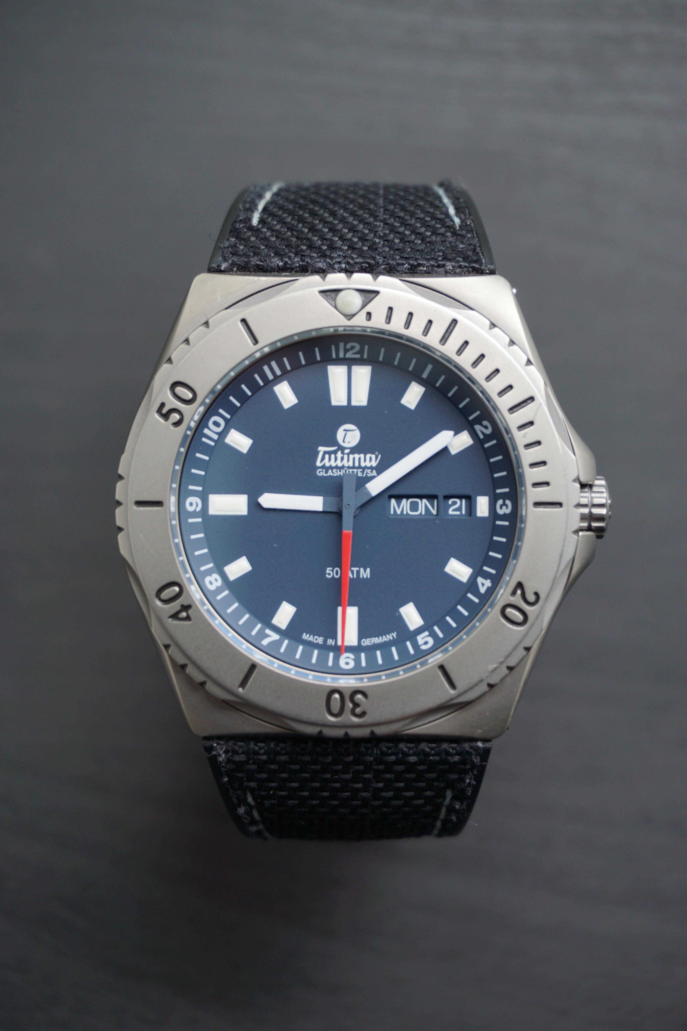 Đồng hồ đeo tay thương hiệu Tutima, dòng sản phẩm M2 Seven Seas, Ref no: 6151-11, mặt số xanh dương, size 44mm, máy tự động, vỏ đồng hồ bằng titanium và dây đeo vải Kevlar, hàng mới 100%