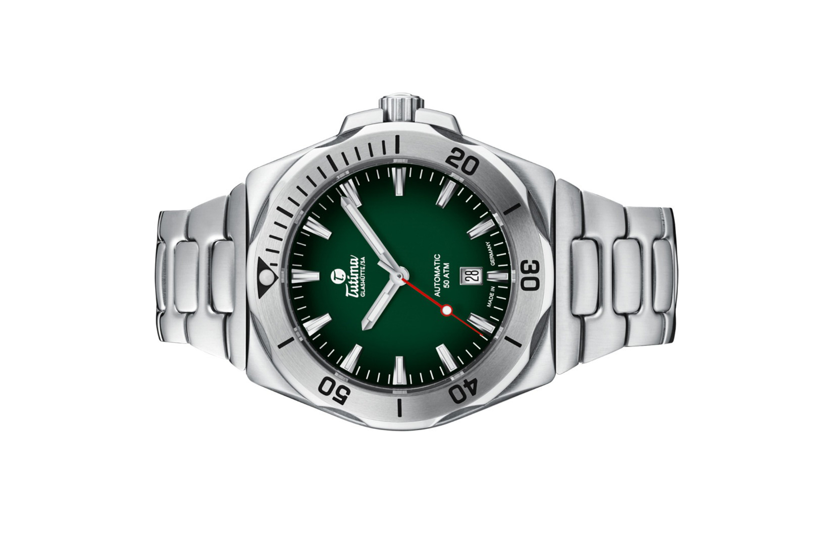 Đồng hồ đeo tay thương hiệu Tutima, dòng sản phẩm M2 Seven Seas S, Ref no: 6155-06, mặt số xanh lá Dégradé, size 44mm, máy tự động, vỏ đồng hồ và dây bằng thép không gỉ, hàng mới 100%