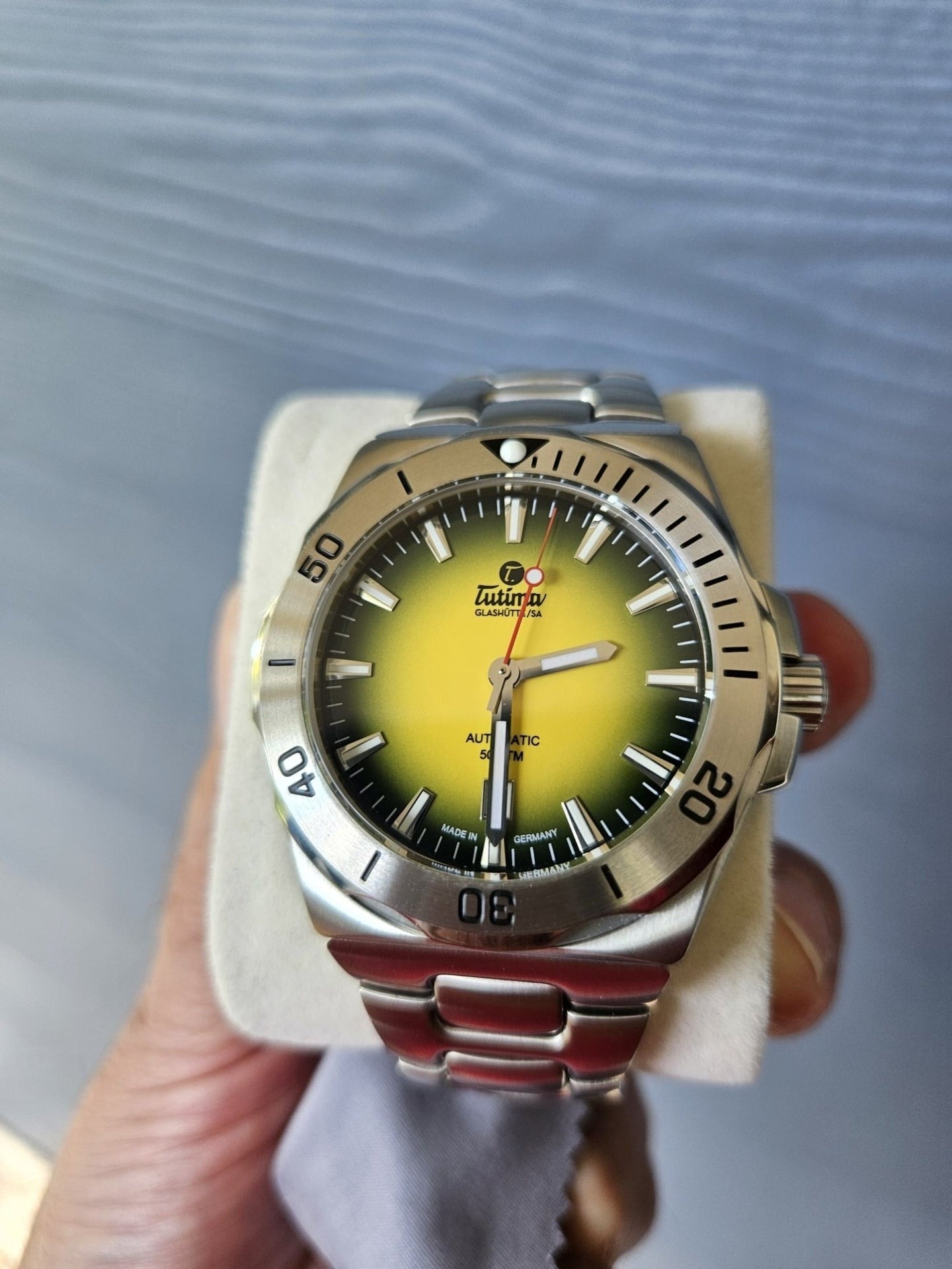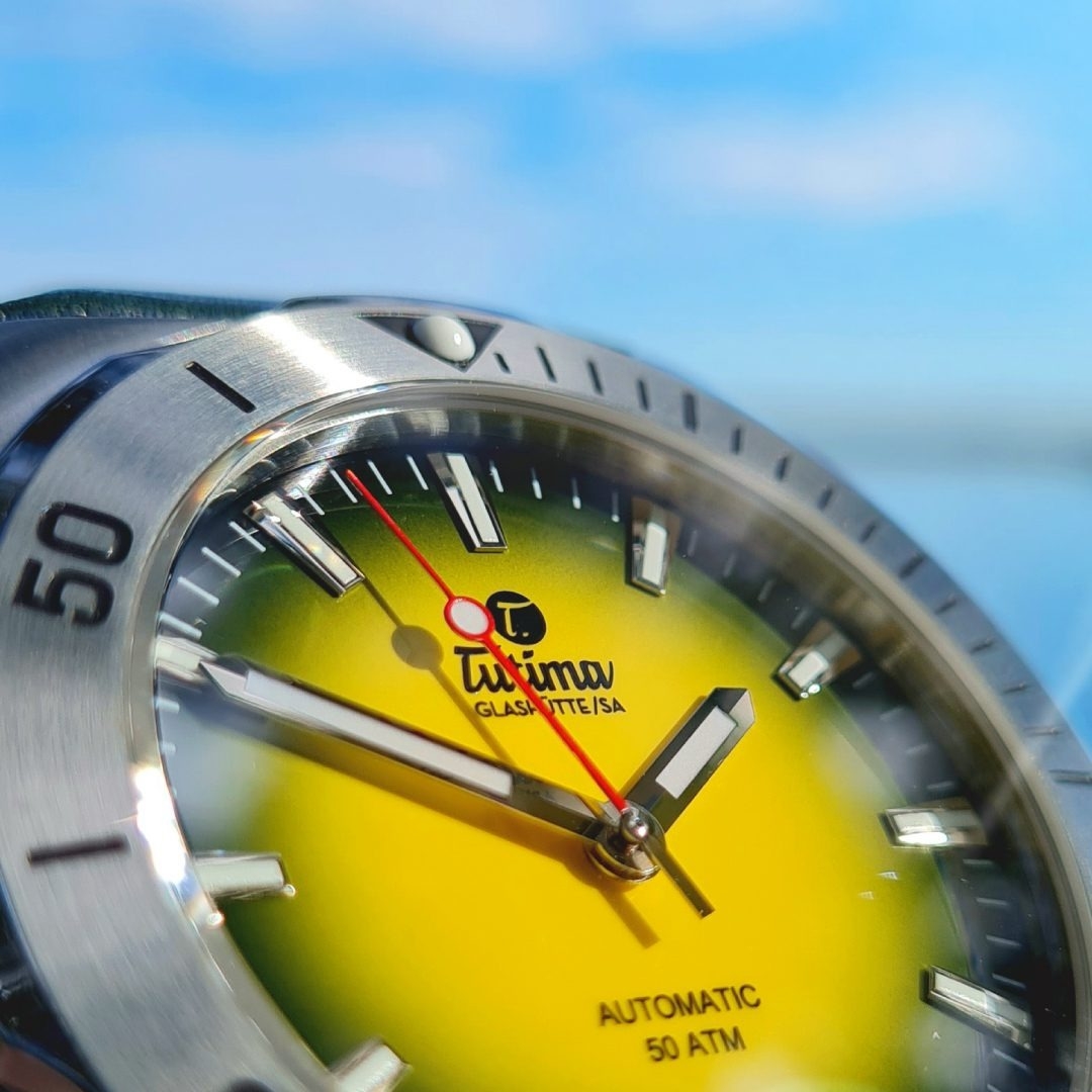 Tutima từ lâu đã được giới yêu đồng hồ nhắc đến như một niềm tự hào của Glashütte – vùng đất luôn đi đôi với những cỗ máy thời gian và bề dày truyền thống chế tác tại Đức. Nằm trong dòng sản phẩm M2 Seven Seas S, mẫu Tutima M2 Seven Seas S (Ref: 6155-10) tiếp nối câu chuyện về đam mê khám phá và chinh phục đại dương, nhưng lần này lại gây ấn tượng bởi mặt số màu vàng Degradé độc đáo. Đây là chiếc đồng hồ được định hình cho người mong muốn thể hiện phong cách khác biệt, vừa khẳng định cá tính, vừa trân trọng giá trị kỹ thuật chuẩn Đức.