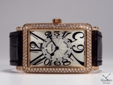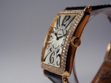 Sự tinh tế của chiếc đồng hồ được thể hiện ngay từ cái nhìn đầu tiên khi chúng ta thấy Cọc số Ả Rập thiết kế to, rõ ràng từng đường nét uốn lượn chỉ có riêng ở đồng hồ Franck Muler. Mặt số khắc vân guiloché thủ công ẩn hiện trên nền trắng bạc. Chiếc đồng hồ có vỏ được làm từ chất liệu vàng hồng nguyên khối 18k. Kết hợp hài hoà giữa công nghệ cao và bí quyết truyền thống, những mẫu đồng hồ Franck Muller dành cho nam vốn gắn liền hình ảnh của mình với quý ông lịch lãm, cá tính giờ đây đã được điểm thêm ánh sáng lấp lánh của kim cương để sóng đôi cùng phái đẹp. Vòng bezel và khoá được khảm những viên kim cương cao cấp, đúc theo dáng chữ nhật ôm vừa trọn cổ tay người đàn ông thành đạt.