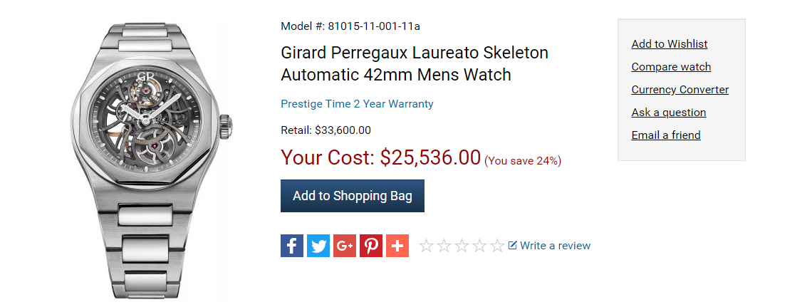 Girard Perregaux Laureato với bộ vỏ được làm từ thép không gỉ cao cấp, mặt số Skeleton chắc chắn sẽ làm mê hoặc những khách hàng đam mê đồng hồ cơ học.