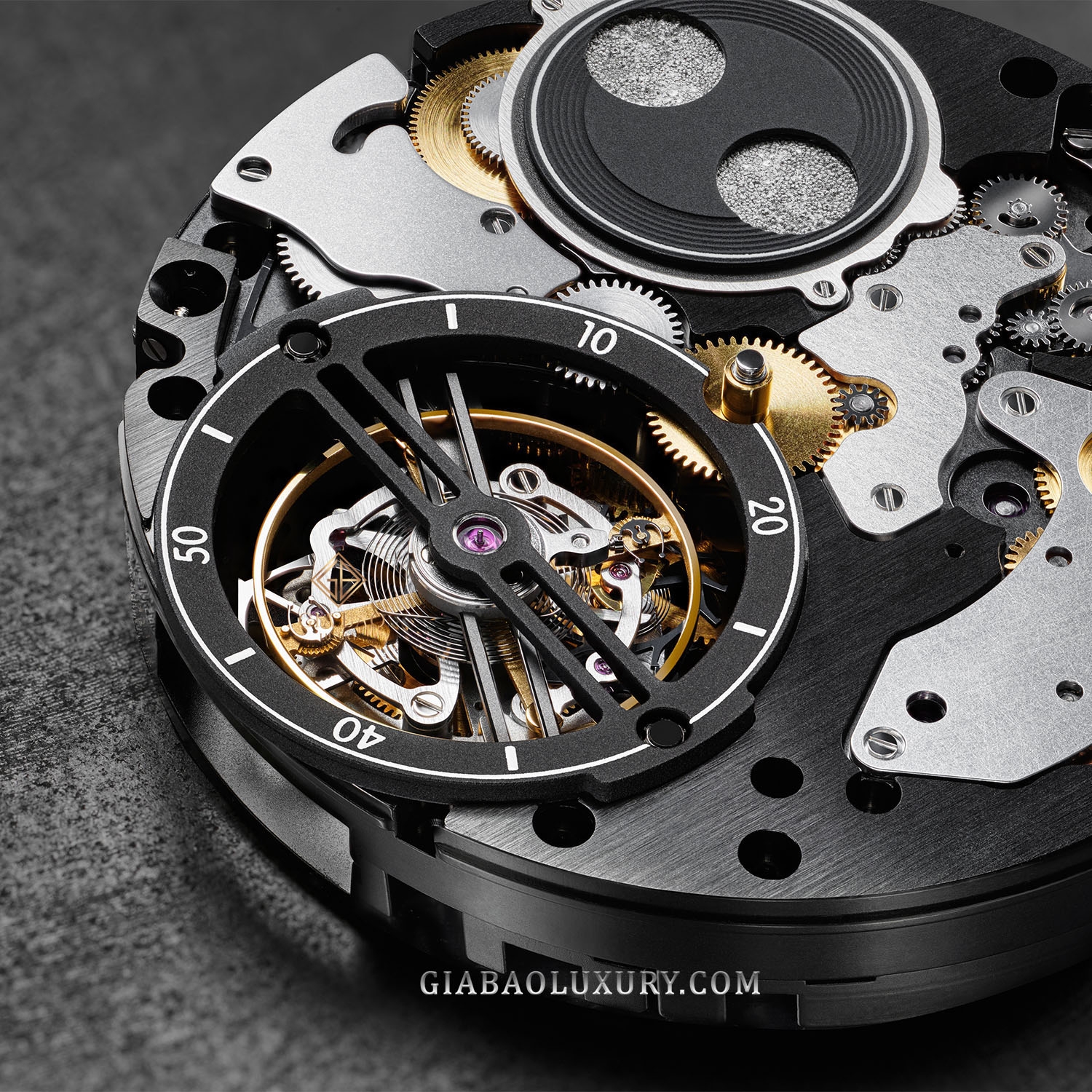 Bên cạnh Tourbillon, ta còn có thêm lịch tuần trăng được đặt ở góc trên của mặt số. Chỉ báo này được chia ra rõ ràng, phân biệt hai bán cầu để người dùng ở Bán cầu nam hay Bán cầu Bắc đều có thể quan sát vị trí của Mặt Trăng. Bên dưới đó, ta có bộ hiển thị thời lượng cót, với thời lượng cót tối đa lên tới 96 giờ.