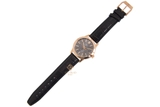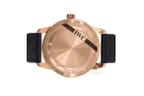 Phần càng nối dây được làm ngắn, dáng thẳng thật sự cứng cáp, được chăm chút hơn bởi những góc cạnh được đánh bóng. Kết nối với đó là bộ dây da cá sấu màu đen, được đệm thêm ở phần đầu dây giúp tăng thêm độ cứng cáp và chắc chắn. Ở mặt sau, phần tiếp xúc với cổ tay, IWC đã sử dụng da bê mềm mại, có dập tên thương hiệu sắc nét. Bộ dây này được cố định bởi khóa cài bằng vàng khối có khắc tên thương hiệu.