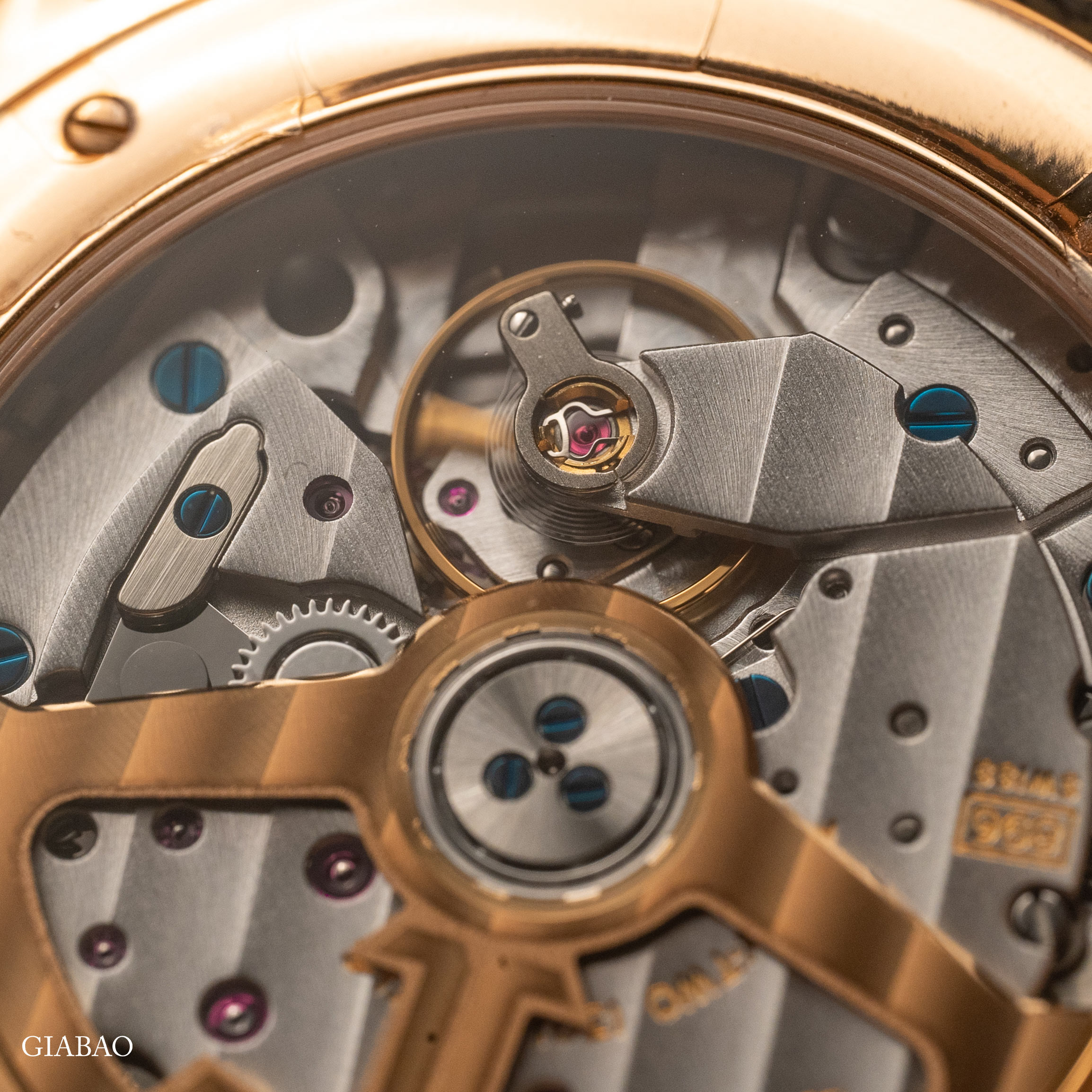 Lật đồng hồ lại, đó là lúc bộ máy chất lượng của thương hiệu có lịch sử sản xuất các bộ máy cơ khí lộ diện. Trong mẫu đồng hồ Jaeger-LeCoultre Master Control Ultra Thin Q1272510 là bộ máy tự động JLC Caliber 896, có rotor bằng vàng được thiết kế skeleton, theo khuôn hình cái móc câu, cũng là logo của thương hiệu. Bên dưới là tấm khung, cầu nối có chứa các chân kính hồng, đinh ốc xanh. Được xác định là một bộ máy siêu mỏng, JLC Caliber 896 có chiều cao 3,98mm mà vẫn có khả năng trữ cót trong vòng 43 giờ đồng hồ.