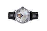 • Mặt số hoàn thiện tỉ mỉ: Bên cạnh họa tiết clous de Paris trên vòng chỉ giờ, phần nền được chạm vân hạt mịn, vát cạnh bằng tay, kết hợp với hiệu ứng mạ rhodium. Những chi tiết này thường chỉ xuất hiện ở phân khúc đồng hồ nghệ nhân cao cấp.