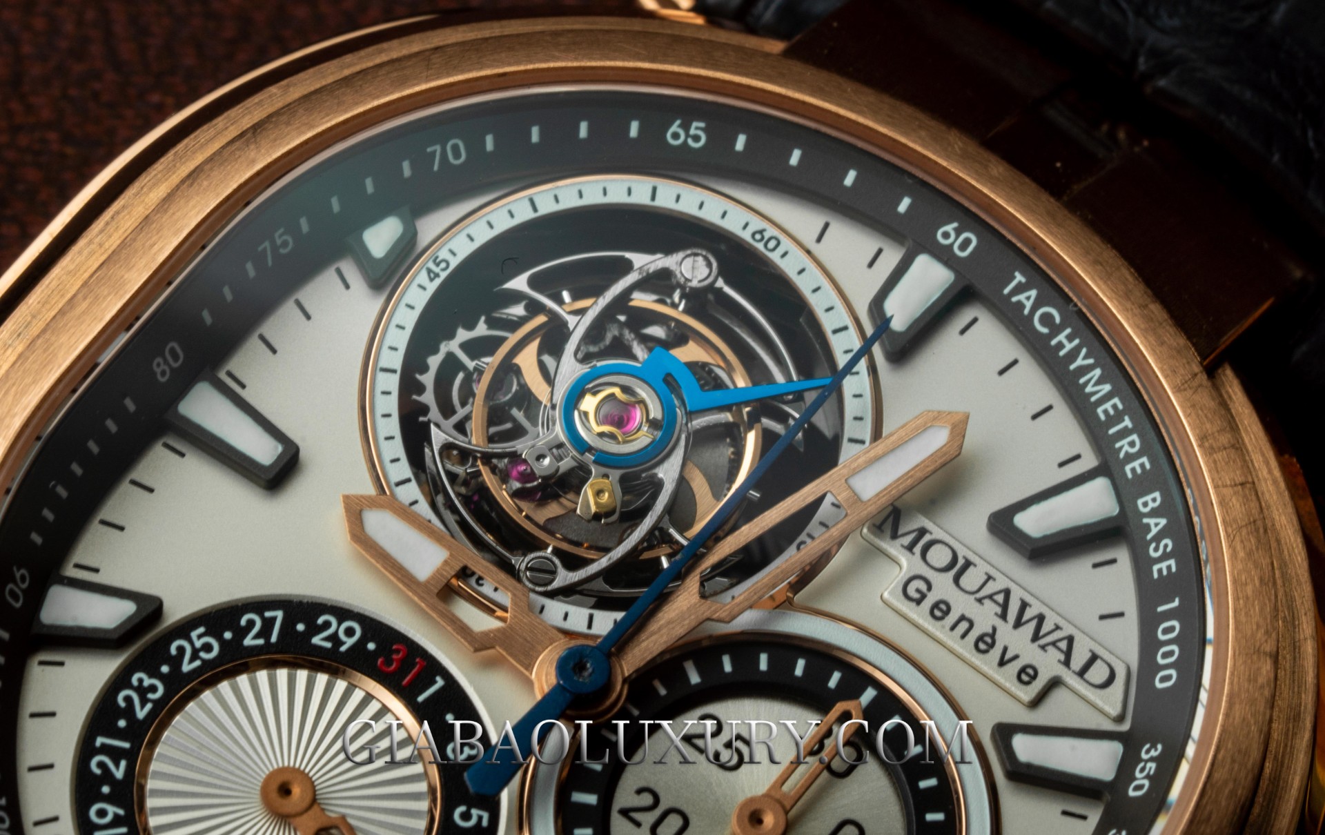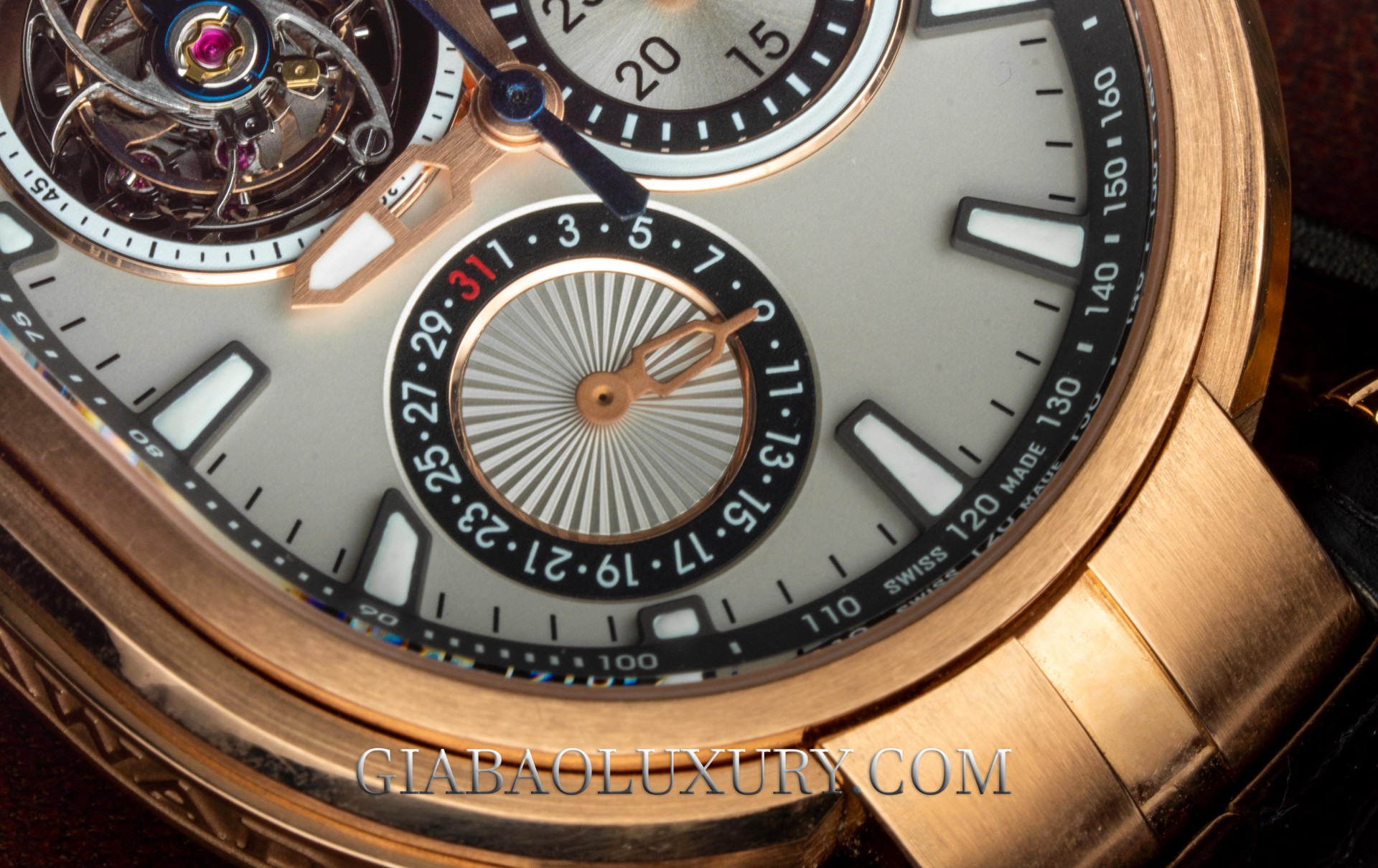 Đơn cử là một lồng tourbillon gia cố tính chính xác cho cả chiếc đồng hồ được đặt tại góc từ 10h đến 12h. Tại lồng tourbillon này, nhà sản xuất đã tinh tế lồng ghép một kim xanh chạy quanh vòng tròn nhỏ trong vòng 60 giây cơ bản. Chạy đến góc từ 7h đến 8h là bộ hiển thị ngày màu trắng viền đen có kích thước nhỏ hơn lồng tourbillon và được hoàn thiện với những vân sóng nước có khả năng phả xạ ánh sáng tốt nhất trên mặt số. Tại đây cũng có một kim nhỏ màu xanh đảm nhiệm vị trí chỉ báo ngày trong tháng.