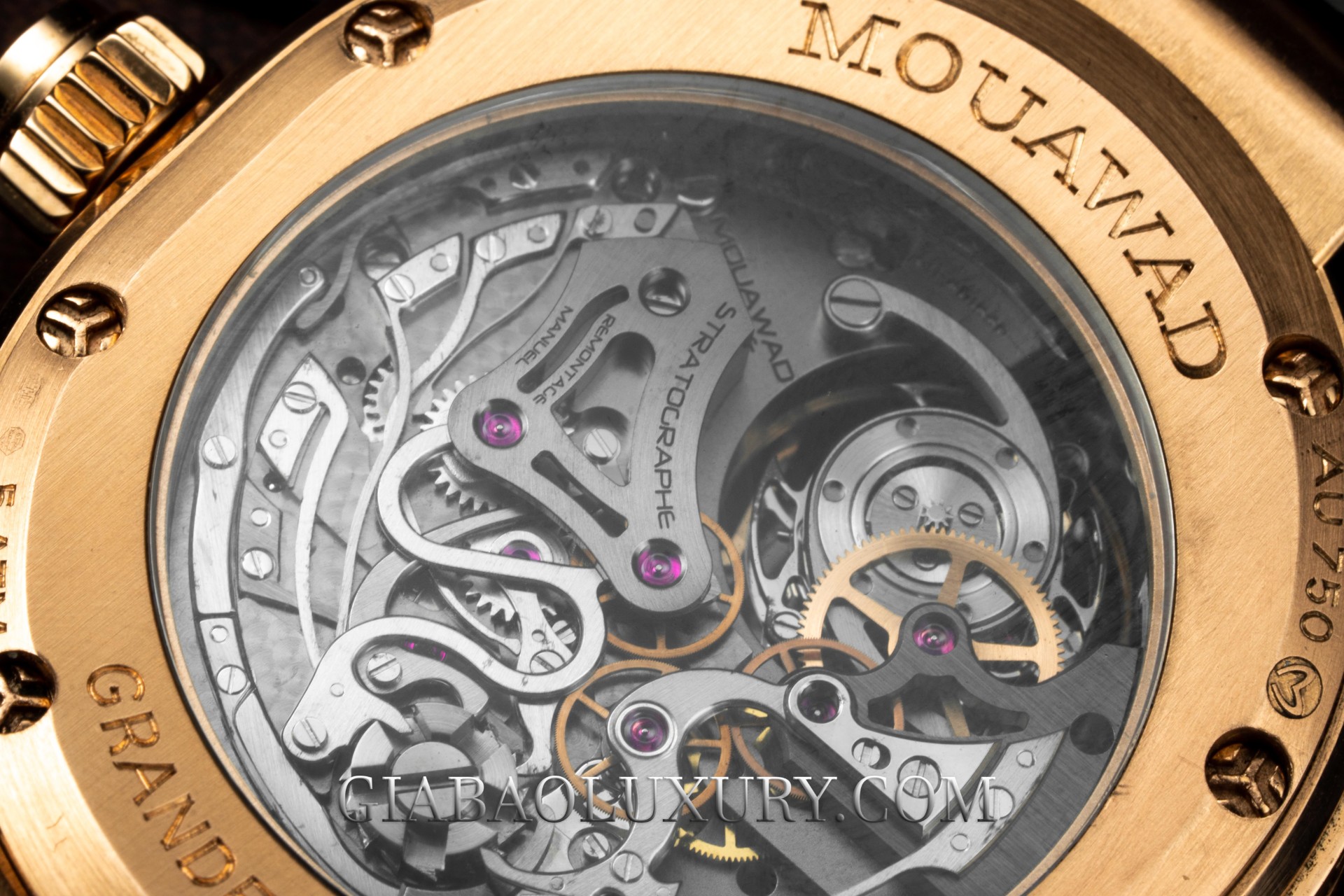 Cỗ máy này khiến giới mộ điệu trầm trồ và thán phục với việc tích hợp rất nhiều tính năng trong bộ vỏ khung bằng vàng hồng, kích thước 43.82 x 56.70 mm. Bên trong của bộ vỏ của chiếc Grande Ellipse Chrono Mono Poussoir Tourbillon là một bộ máy lên cót tay đã được nghiên cứu và chế tạo in-house bởi chính Mouawad.