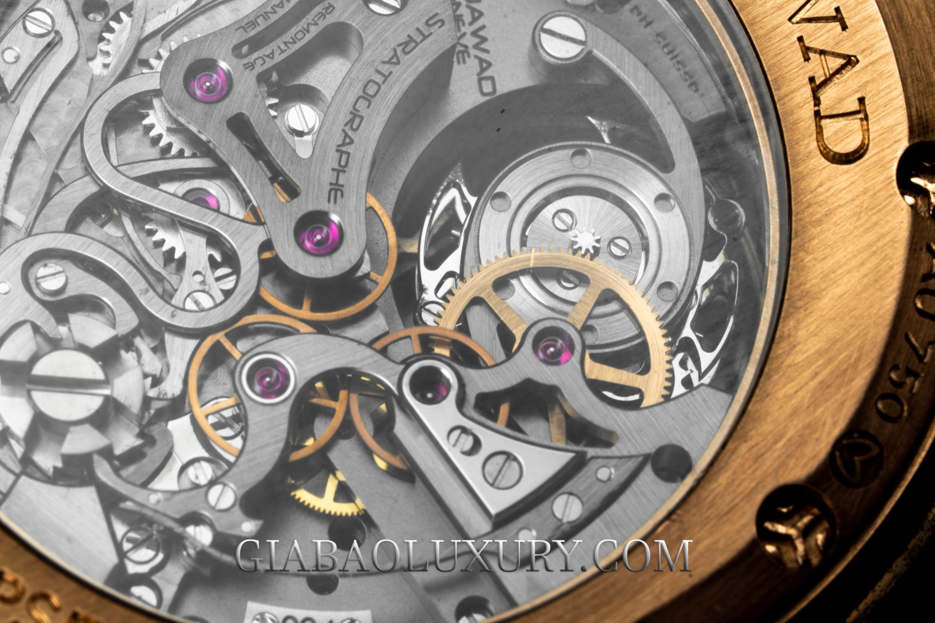 Với lớp kinh sapphire đằng sau mặt đáy, người yêu đồng hồ có thể chiêm ngưỡng cơ chế bánh xe cột thông minh một cách đơn thuần. Với con dấu Geneva đảm bảo chất lượng đầy danh tiếng của Thụy Sỹ, những chi tiết bên trong bộ máy đã được hoàn thiện cẩn thận với những cạnh được vát sáng bóng một cách thủ công. Hay đó còn là sự xuất hiện của hệ thống vân tròn xếp chồng đều đặn mà đầy tính thẩm mỹ.