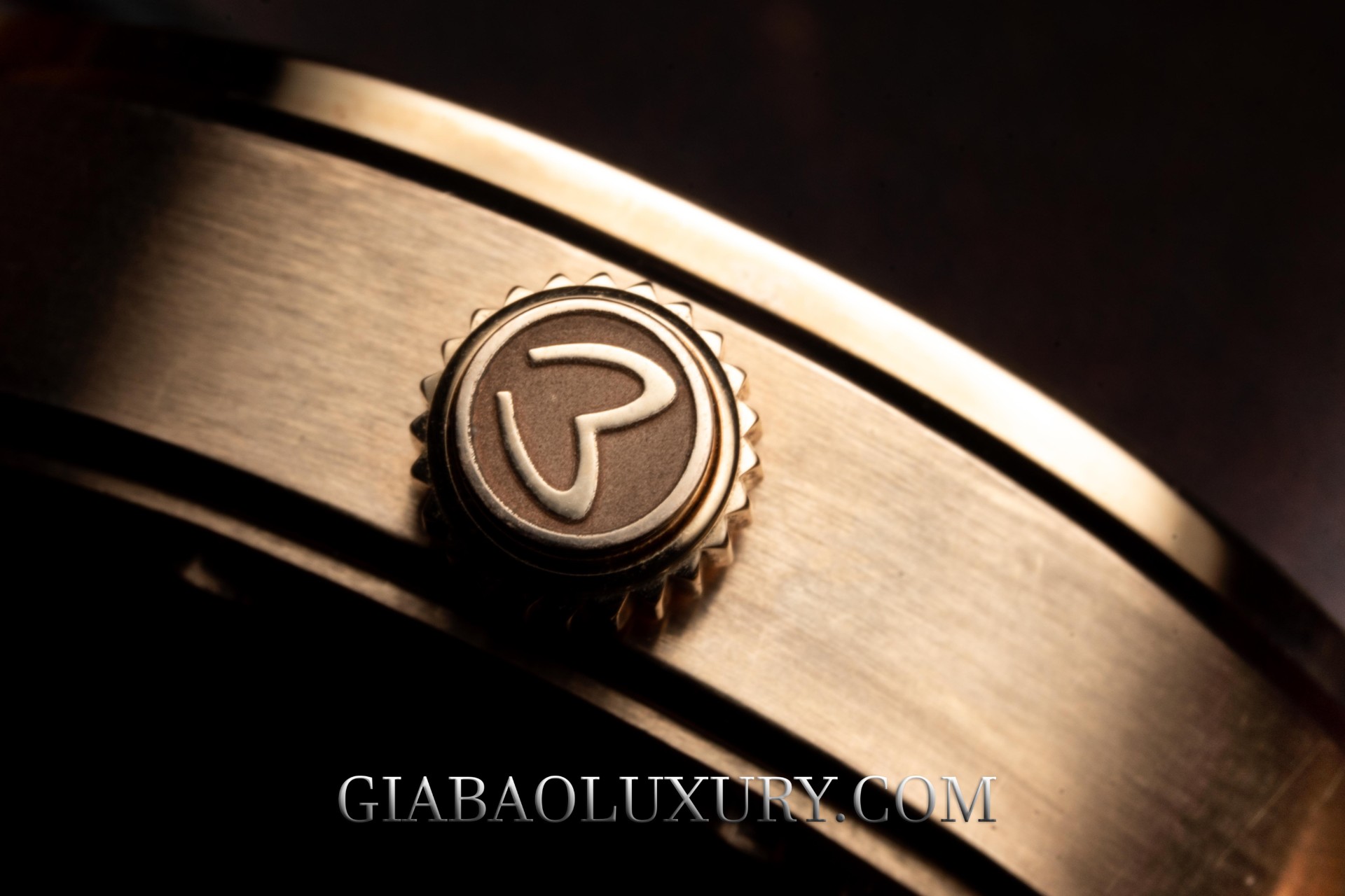 Hoàn thiện bộ vỏ khung được chải xước mờ bề mặt của Grande Ellipse Chrono Mono Poussoir Tourbillon là đây đeo bằng da cá sấu màu đen và khóa gập cũng trong chất liệu vàng hồng cao cấp mà chắc chắn.