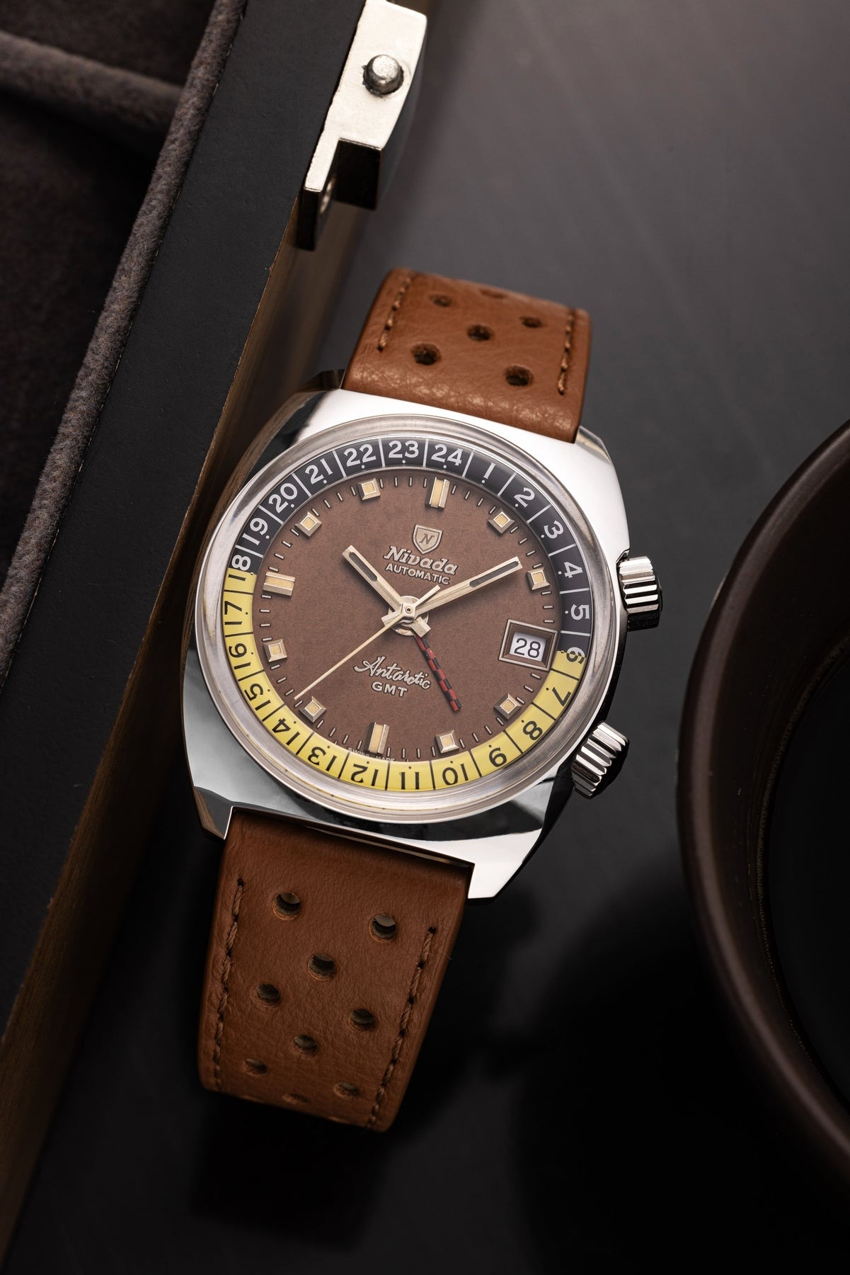 Nhắc đến “Antarctic,” người ta liên tưởng ngay tới khả năng thích nghi môi trường – Nivada Grenchen từng thiết kế dòng đồng hồ này dành cho khí hậu lạnh giá, hành trình thám hiểm. Nay, với GMT, đồng hồ thêm phương tiện theo dõi múi giờ thứ hai, gợi tính quốc tế, du ngoạn đó đây. Vẫn giữ vẻ retro, Ref. 32061A được nâng tầm qua mặt số nâu “tropical,” mang đậm dấu ấn thập niên xưa cũ, nhưng hợp xu hướng “máy tự động,” “GMT function.”