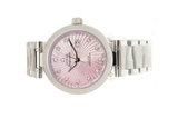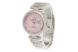 Bên dưới mặt kính là mặt số đồng hồ màu hồng đầy nữ tính với những vân họa tiết dạng lốc xoáy cực kỳ hút mắt. Những hình ảnh trên mặt số như có một ma lực lạ kỳ, hấp dẫn bất kỳ ai nhìn vào chiếc đồng hồ này từ ngay lần đầu tiên. Để tăng thêm phần lộng lẫy, cọc số đồng hồ cũng lần lượt được thay thế bởi 11 viên kim cương lấp lánh, đem lại vẻ đẹp sang trọng và đẳng cấp cho chiếc đồng hồ. Bên cạnh tính năng báo thời gian. chiếc đồng hồ còn báo lịch ngày góc 3 giờ quen thuộc.