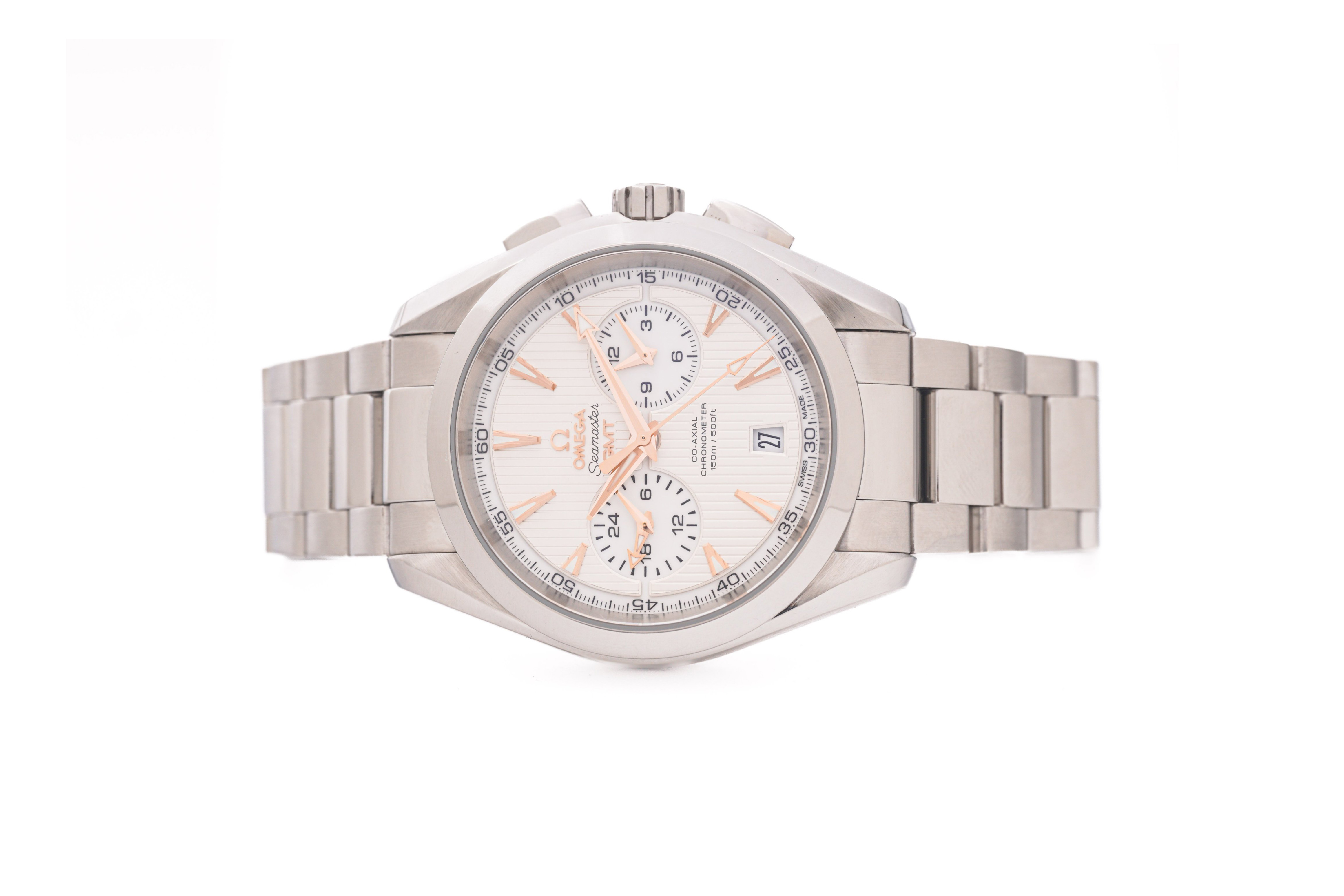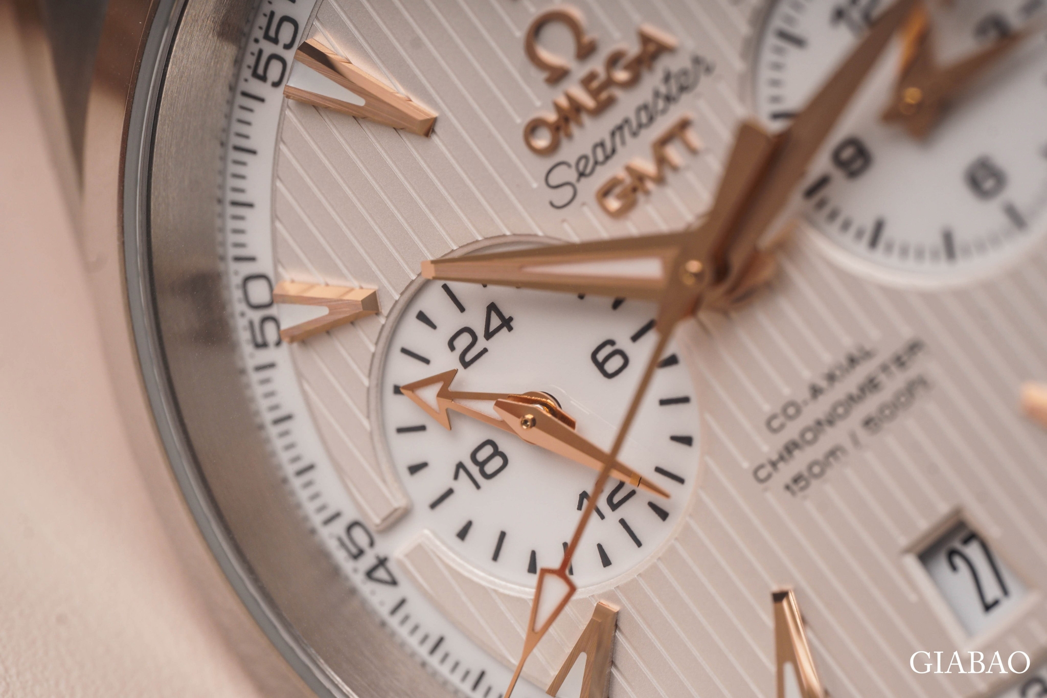 Seamaster Aqua Terra 231.10.43.52.02.001 là một chiếc đồng hồ phức tạp, với nhiều kim chỉ báo hơn thông thường. Theo đó, trong vòng tròn phụ góc 9 giờ là kim giờ GMT (múi giờ thứ hai) và kim giây chỉ thời gian chuẩn. Còn vòng tròn phụ góc 3 giờ có hai kim bằng vàng hồng, cùng phục vụ chức năng bấm giờ chronograph cực kỳ chuẩn xác. Tất cả các chức năng đều được đảm bảo bởi bộ máy OMEGA Co-Axial calibre 9605 đạt chuẩn đo lường Master Chronomaster do viện METAS kiểm chứng.