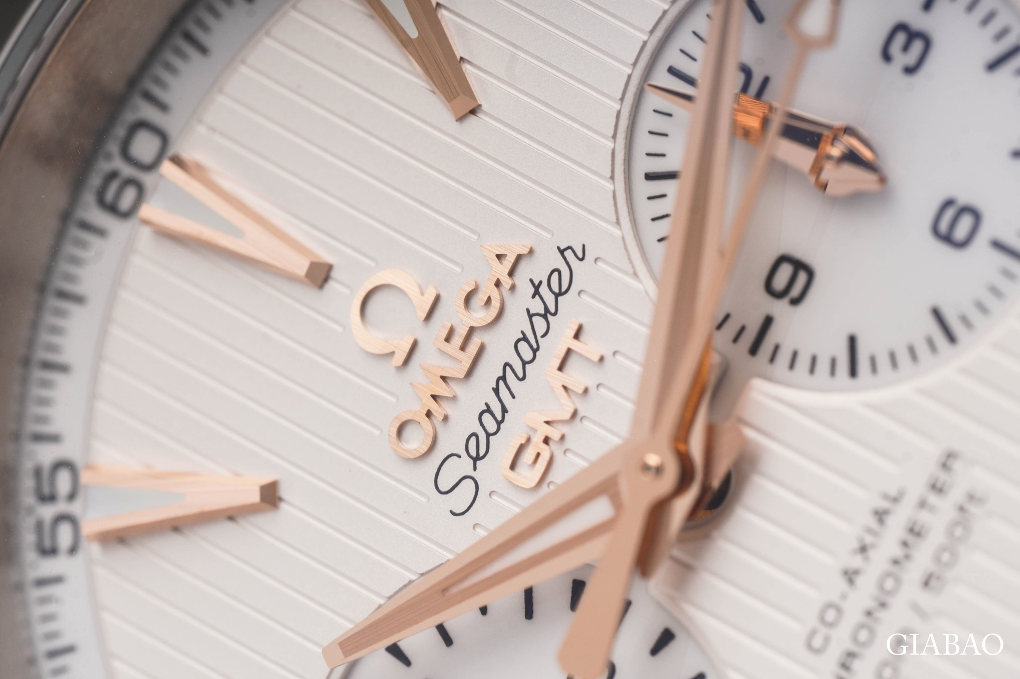 Đơn cử có thể thấy rõ nhất đó là mặt số màu bạc của đồng hồ hiện lên với hoa văn Teak Concept, được Omega thiết kế giống với sàn của những con thuyền gỗ sang trọng. Trong khi đó, hai vòng tròn phụ làm từ sơn mài màu trắng lại là điểm nhấn về mặt thẩm mỹ. Các cọc chỉ giờ hay kim đồng hồ đều được làm từ vàng hồng, tương phản với phần mặt số. Chưa dừng lại ở đó, ở mỗi cọc chỉ giờ hay kim đều có thêm chất phát quang màu trắng, tăng thêm khả năng báo giờ trong môi trường thiếu sáng của chiếc Seamaster Aqua Terra hiện tại.