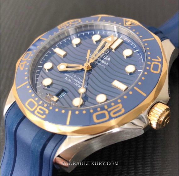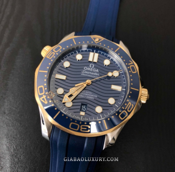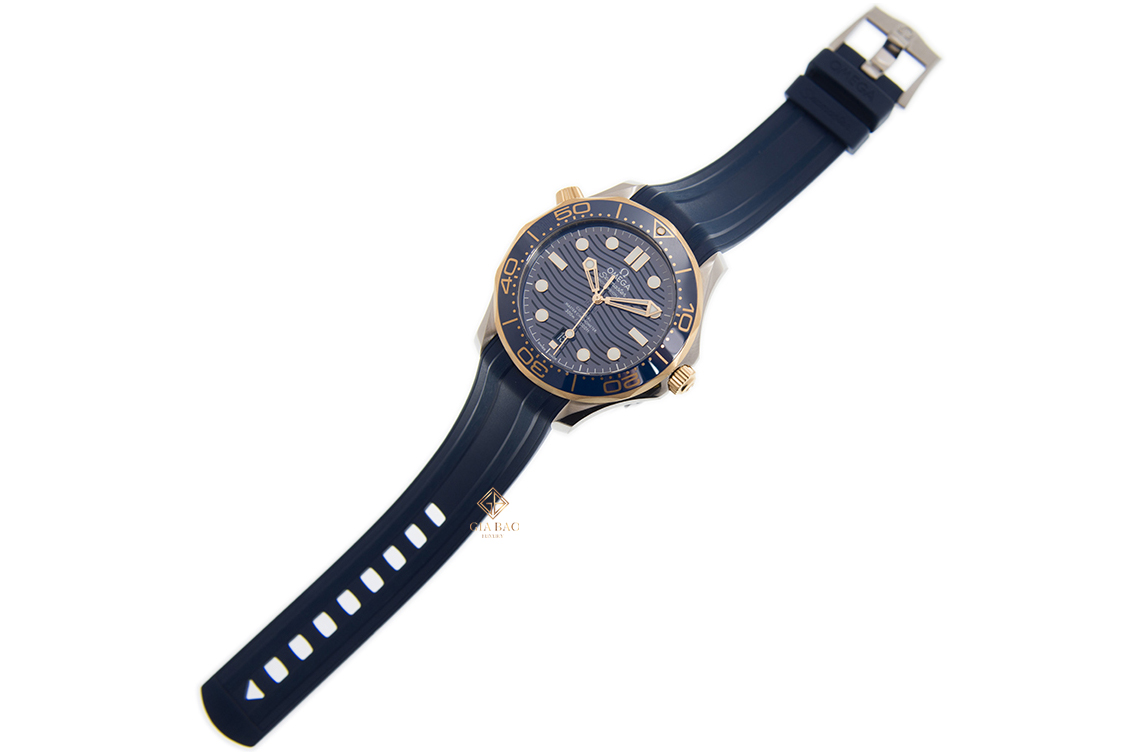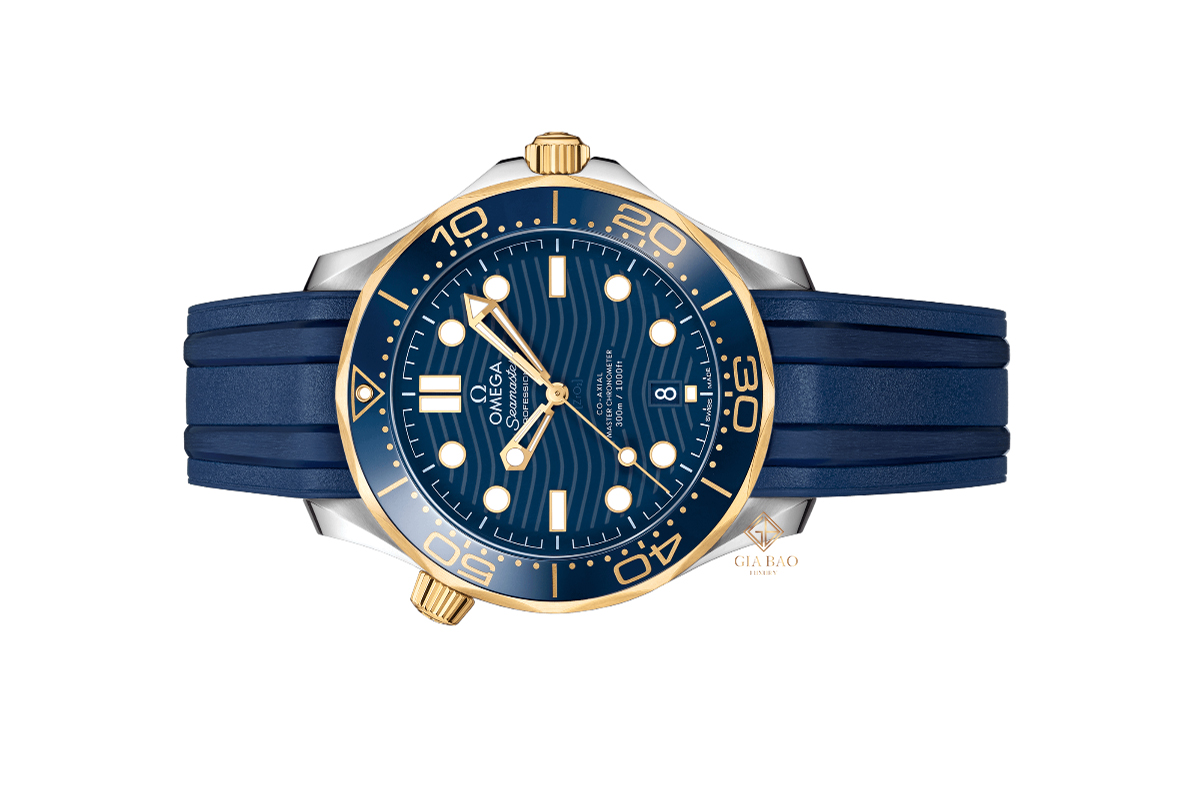 Đồng Hồ Seamaster DIVER 300M 210.22.42.20.03.001 ấn tượng với mặt số bằng gốm Ceramic màu xanh lam được chải xước và tạo hình những con sóng. Bộ kim trung tâm và các mốc chỉ giờ làm từ vàng vàng và phủ đầy Super-lumiNova trắng. Thiết kế này cho phép người sử dụng quan sát giờ tốt hơn trong điều kiện thiếu ánh sáng.