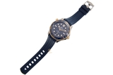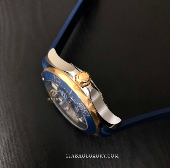 Vành bezel làm từ gốm ceramic xanh kết hợp với vàng vàng được đánh bóng và chải xước một cách tỉ mỉ, tinh tế tích hợp thêm thang lặn Ceragold. Nút chỉnh giờ cũng làm từ vàng vàng. Dây đeo cao su màu xanh lam. Dây đeo cao su mang đến cảm giác thoải mái trên cổ tay của người mang nhờ sự mềm mại của nó.